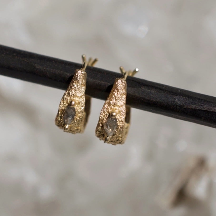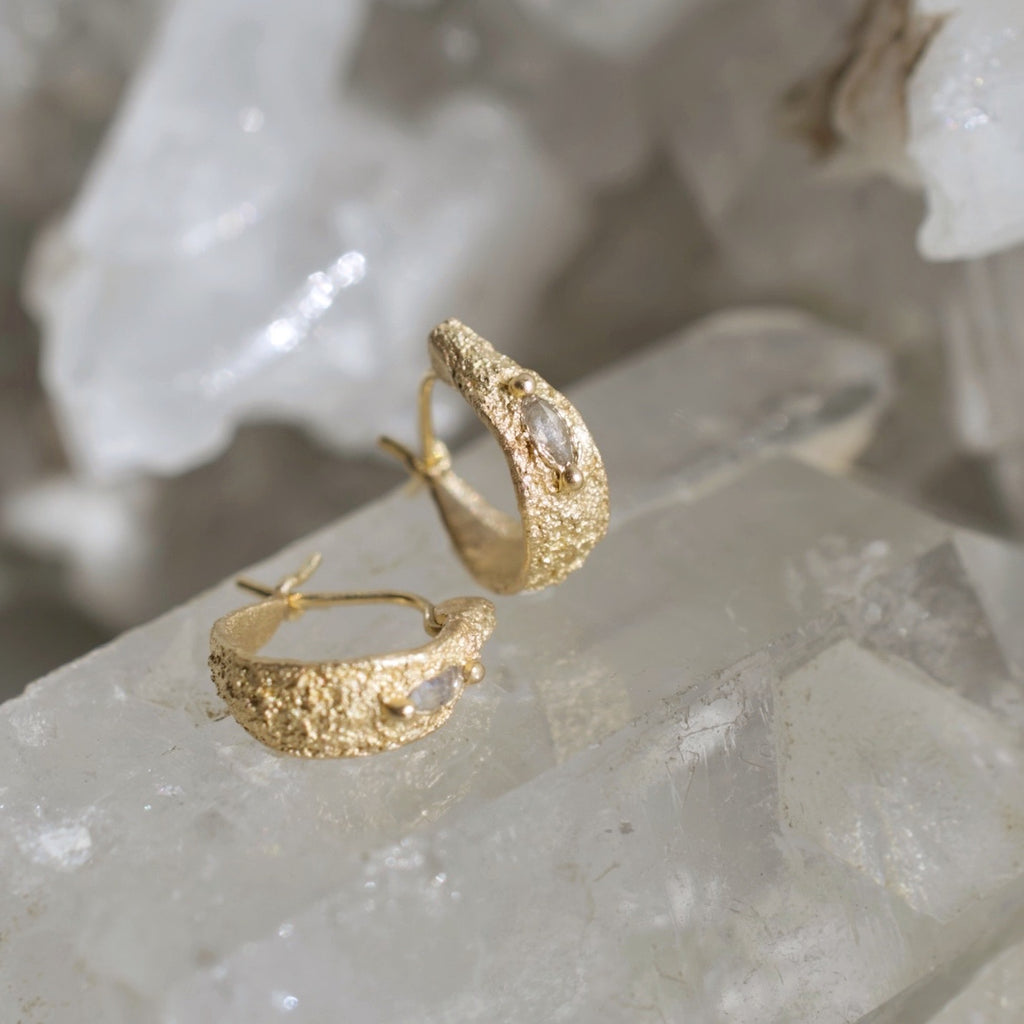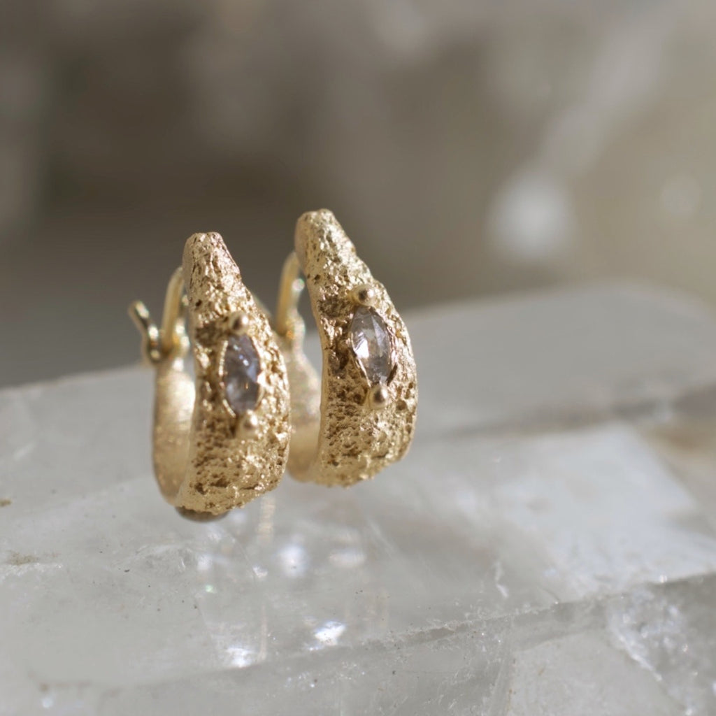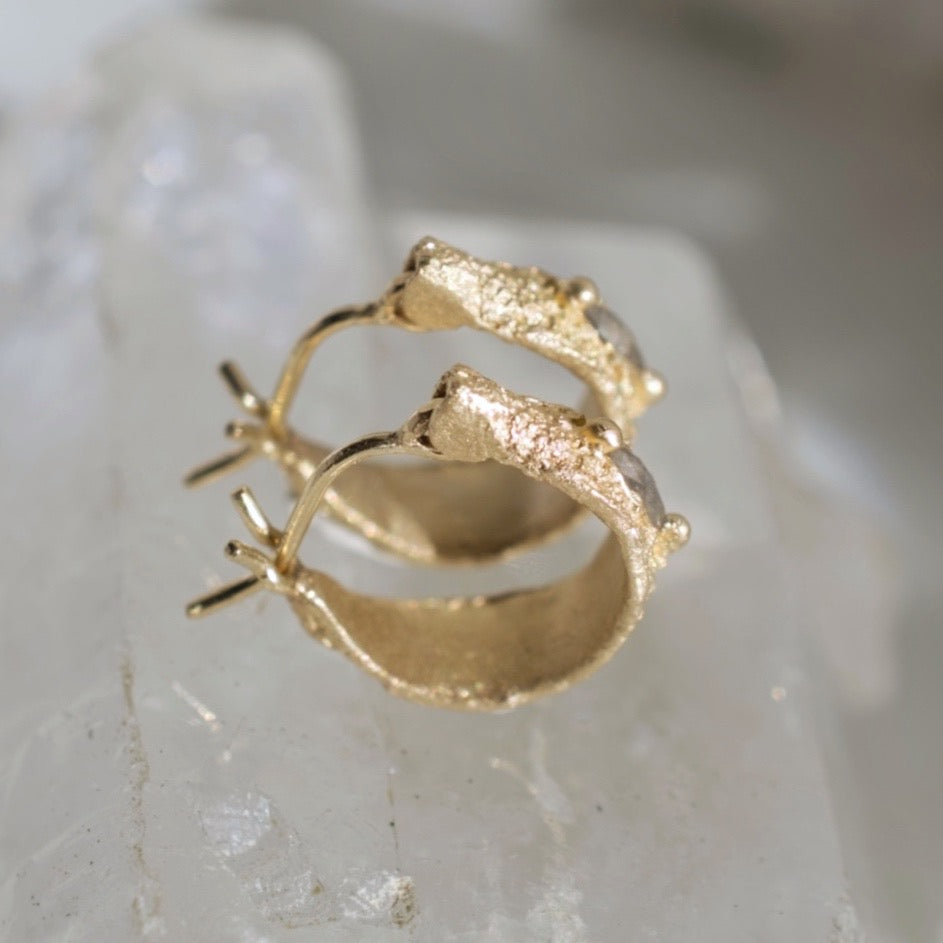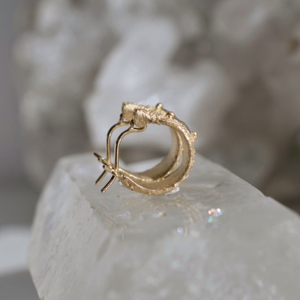 These meticulously textured hoops evoke the magic of unearthing artifacts of a bygone era, capturing the mysticism and elegance of ancient beauty awaiting discovery in the surface of the earth.