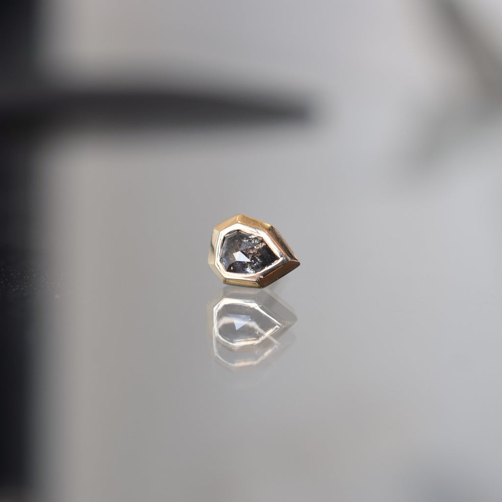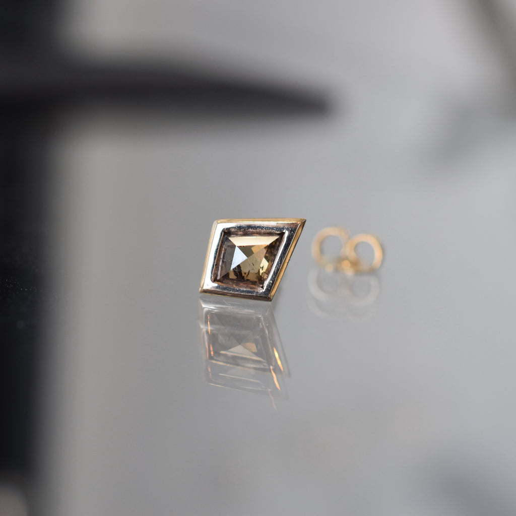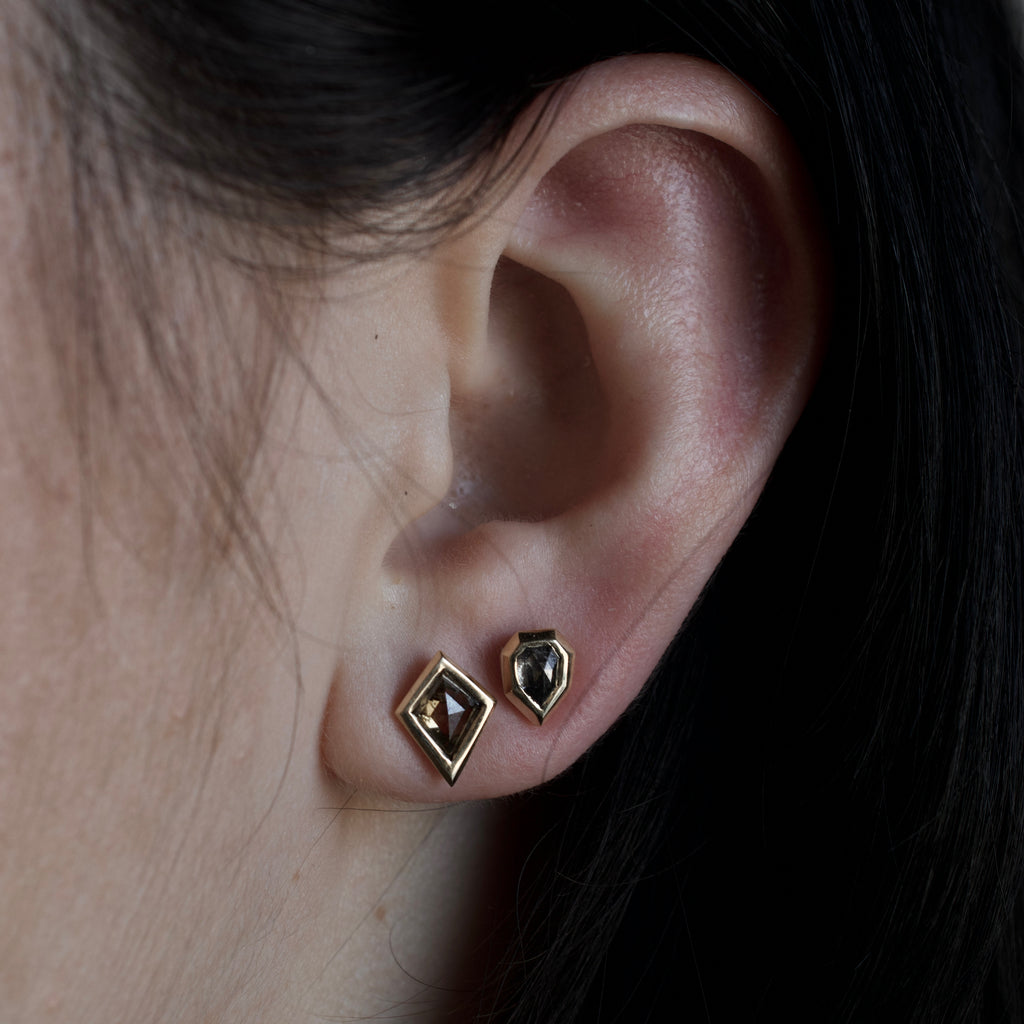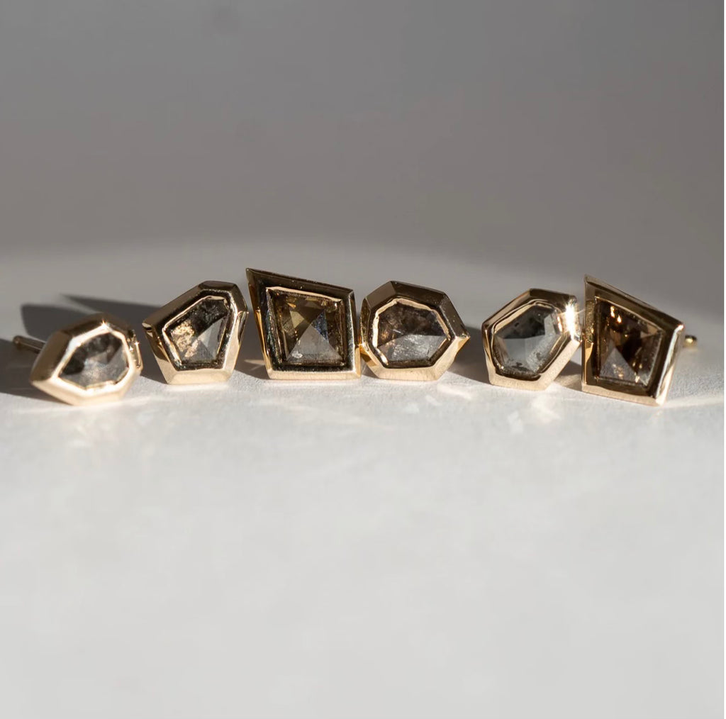 One of a kind geometric cut salt & pepper diamonds in a rich 14k yellow gold setting. These studs make great singles or a mixed shaped pair, either way perfect for ear stacking.