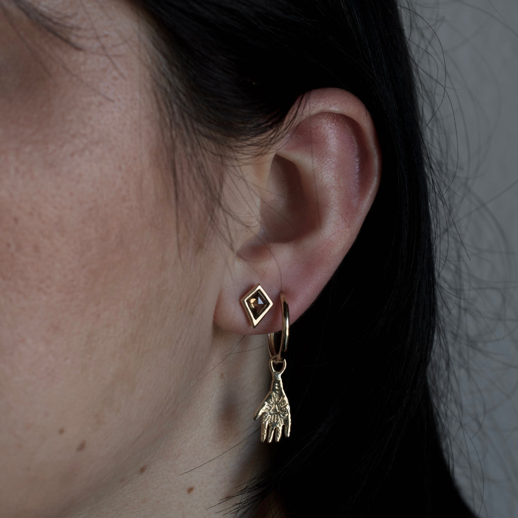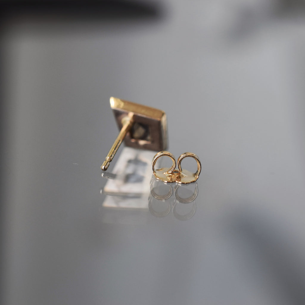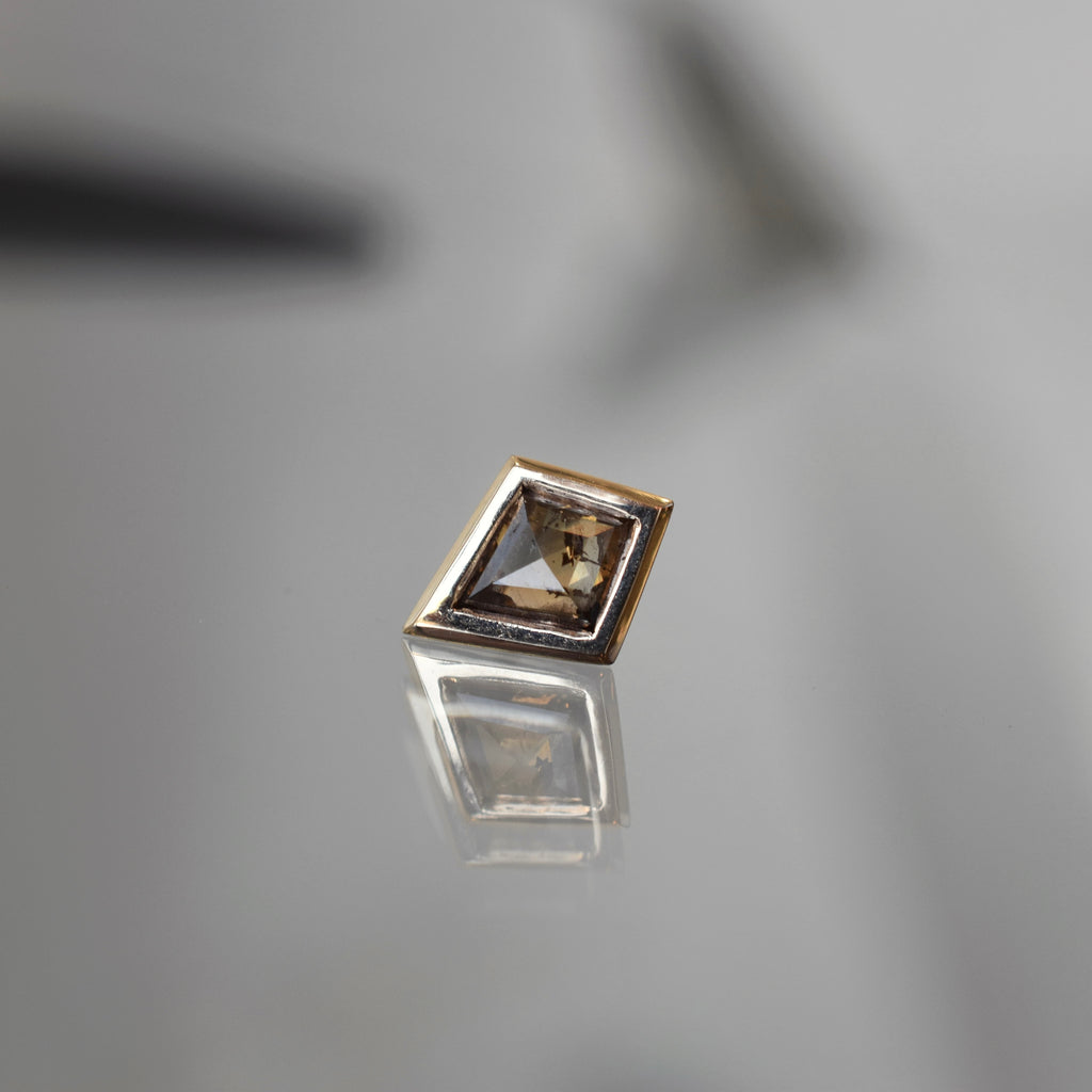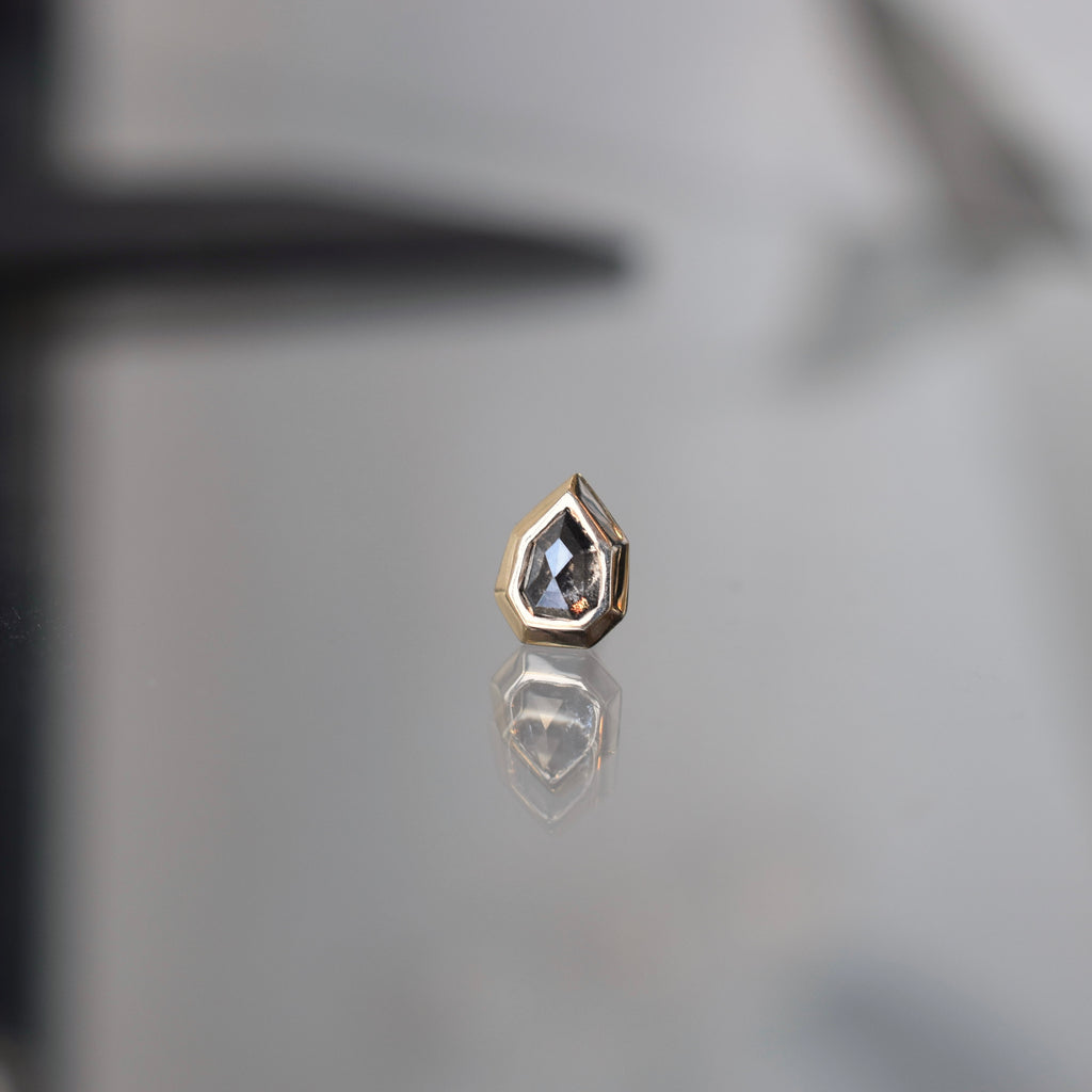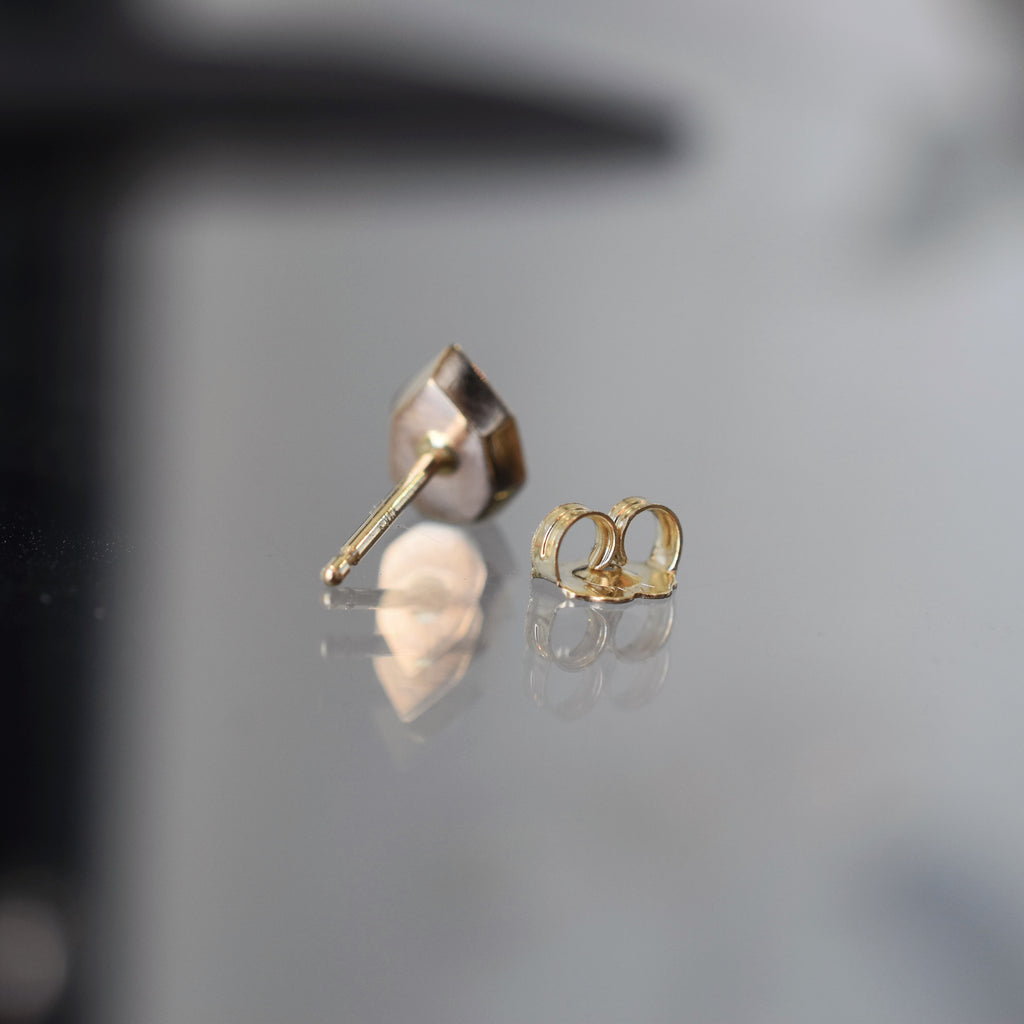 One of a kind geometric cut salt & pepper diamonds in a rich 14k yellow gold setting. These studs make great singles or a mixed shaped pair, either way perfect for ear stacking.