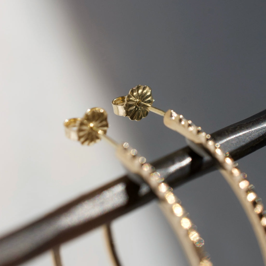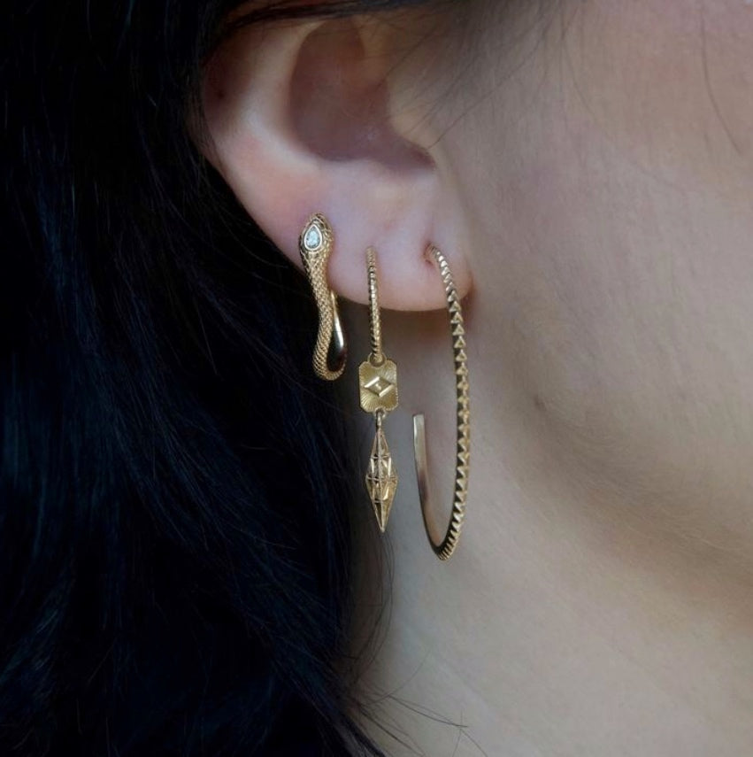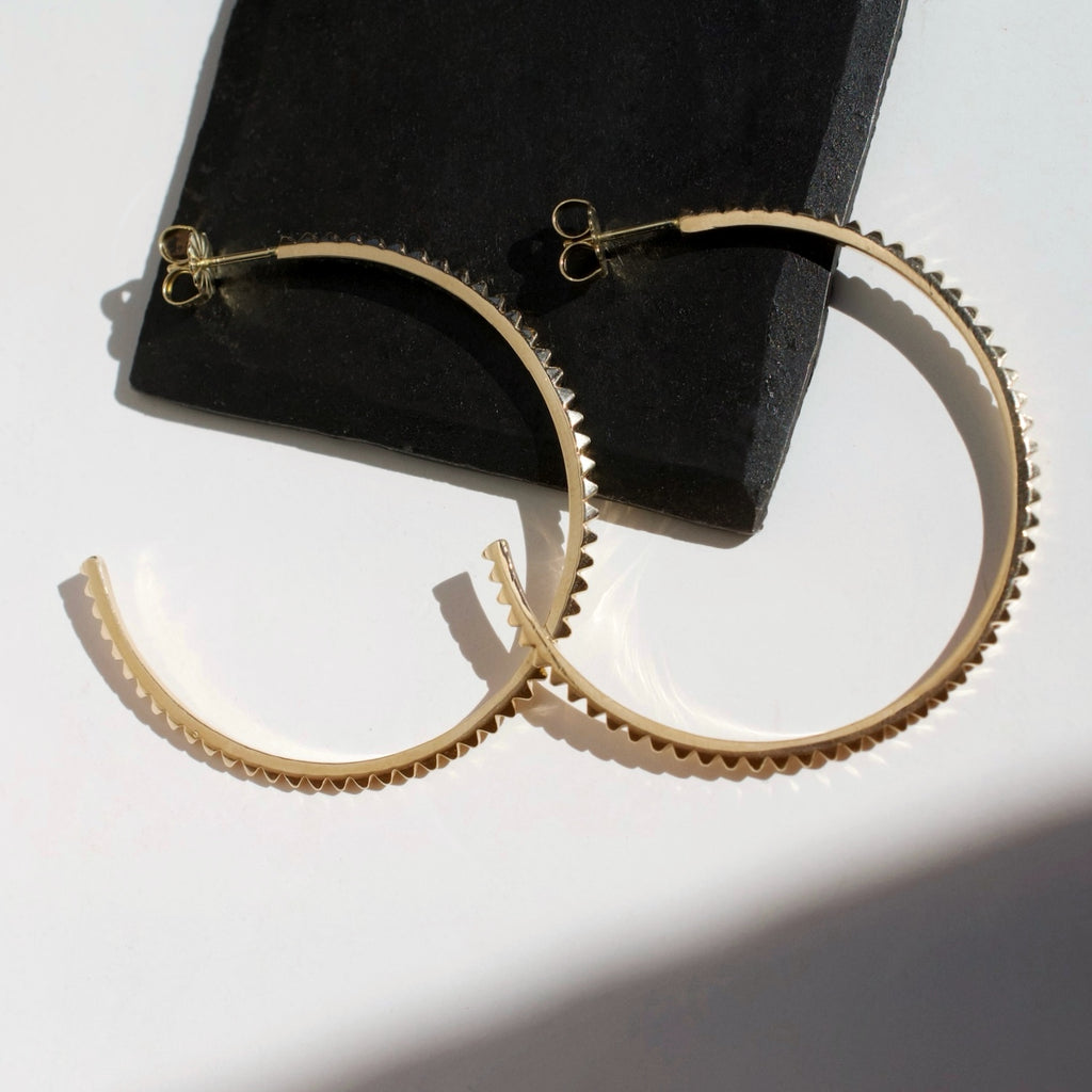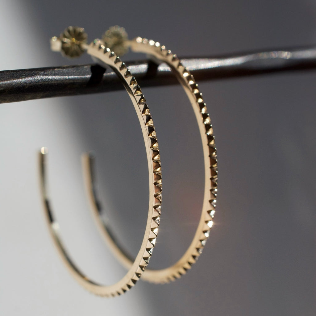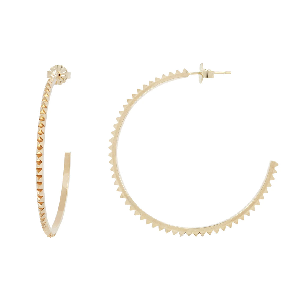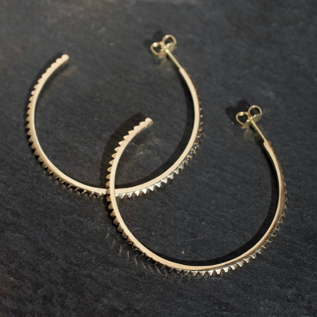 A classic solid gold hoop with a little extra attitude, these hand-carved earrings bring the texture with meticulous pyramid details.