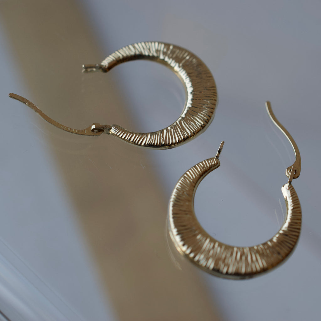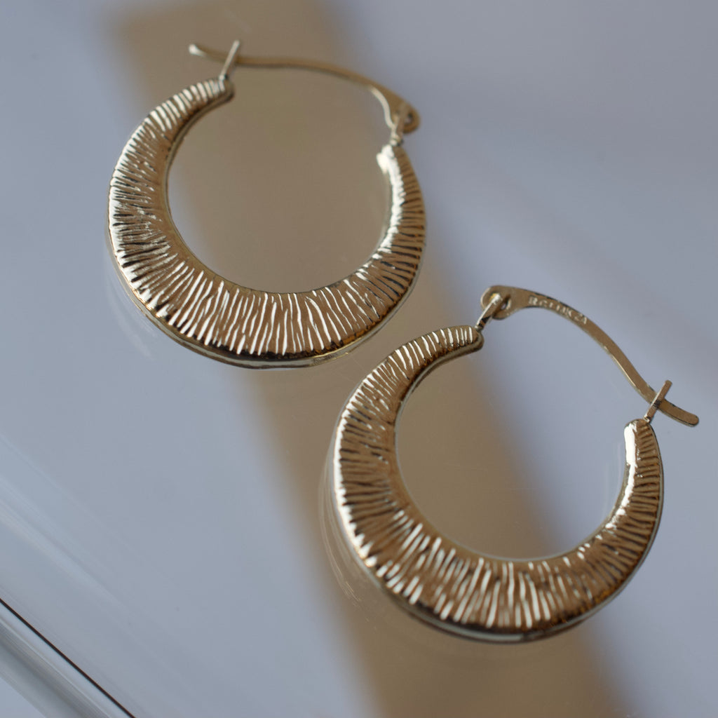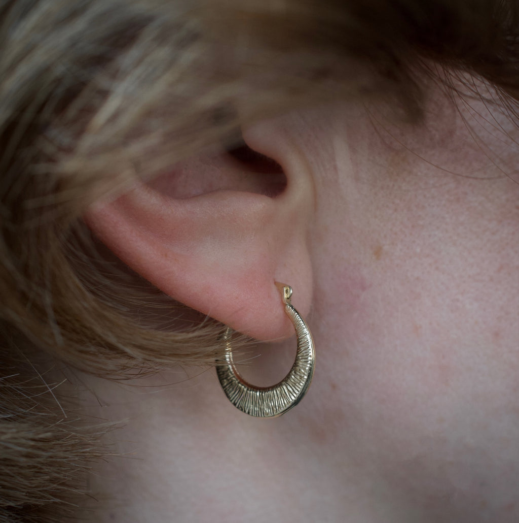We love these hoops for everyday wear. Perfectly lightweight, you can wear them from day to night and everything in between. Their linear texturing lends them an organic, yet architectural feel like an ancient structure weathered with time.