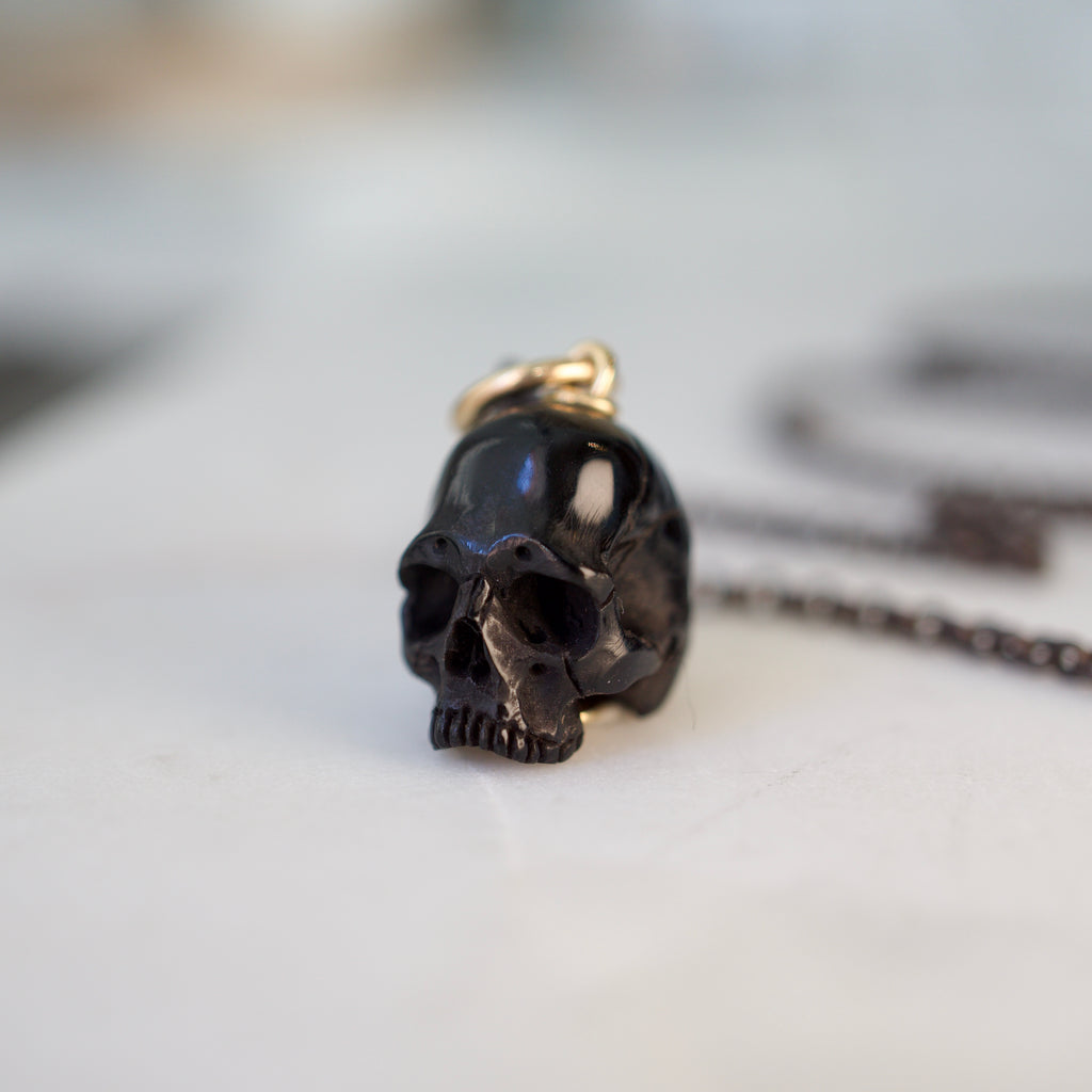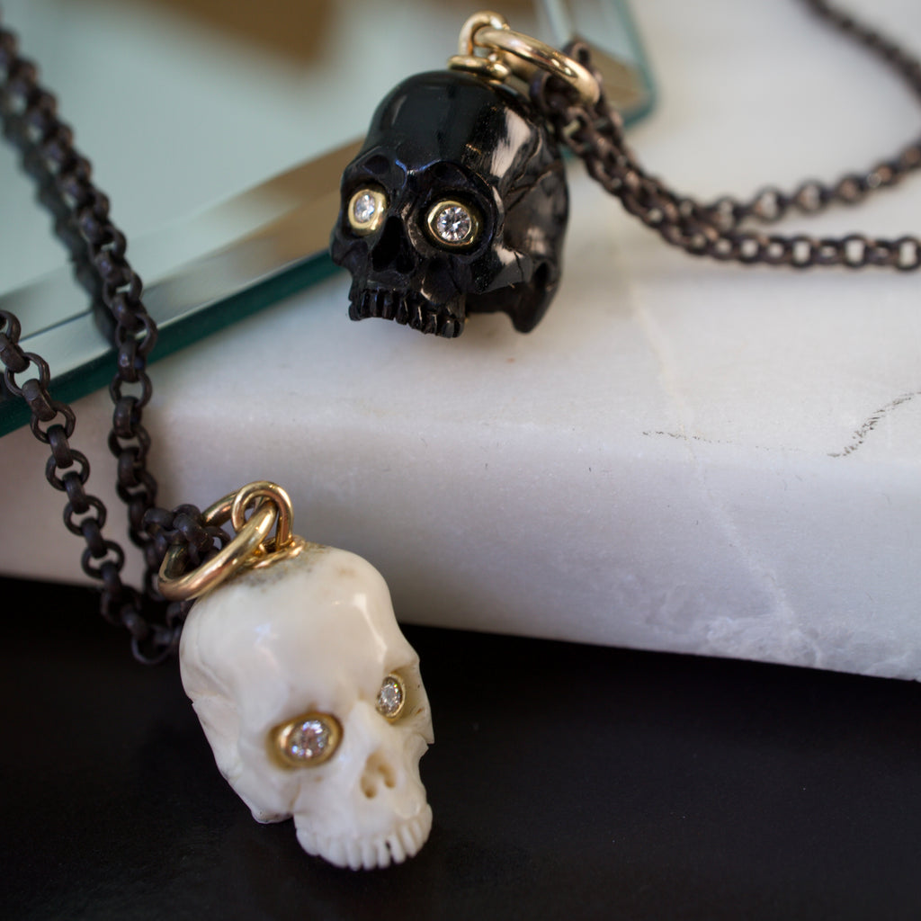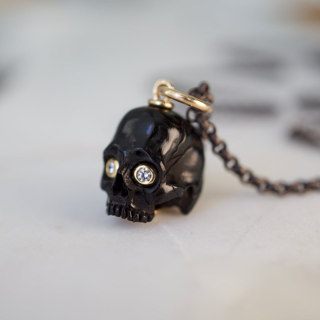 Skulls have long been symbols of the fleeting nature of our existence and a reminder to live life to the fullest. We honor this jewelry making tradition with the creation of this heirloom quality talisman. Hand carved antler, set with 14k yellow gold components and the option of diamond eyes.