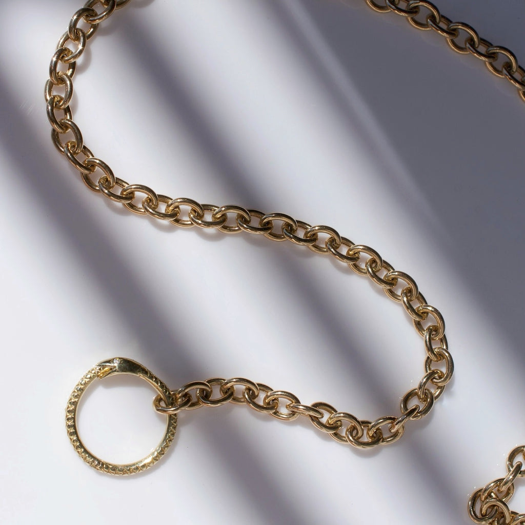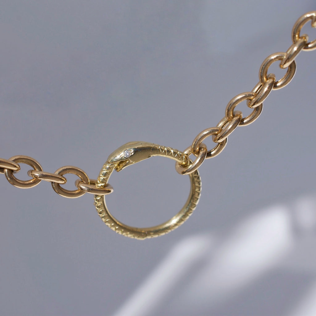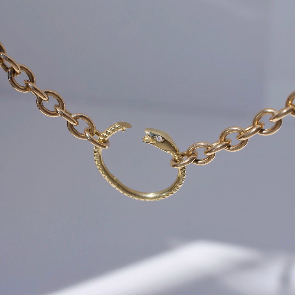 The Ouroboros Necklace has a hinged clasp that joins the tail and the mouth of the snake, creating an illusion of infinite cycling. The clasp is removable, making the ouroboros a versatile piece that can serve as a necklace closure, a charm, or an accent earring.
