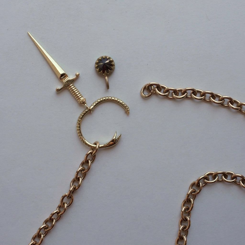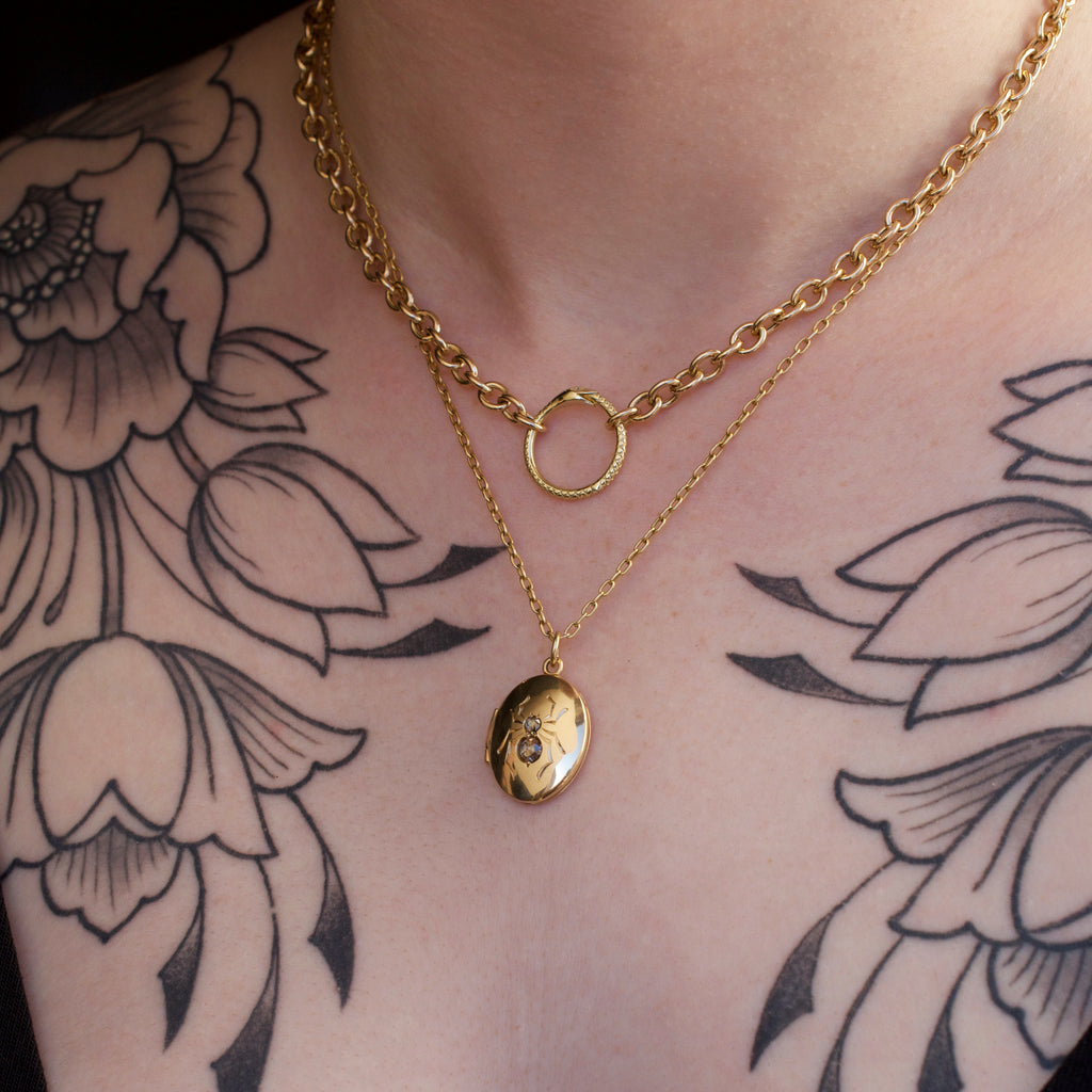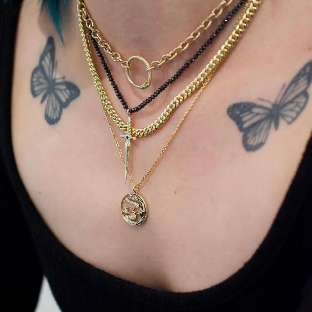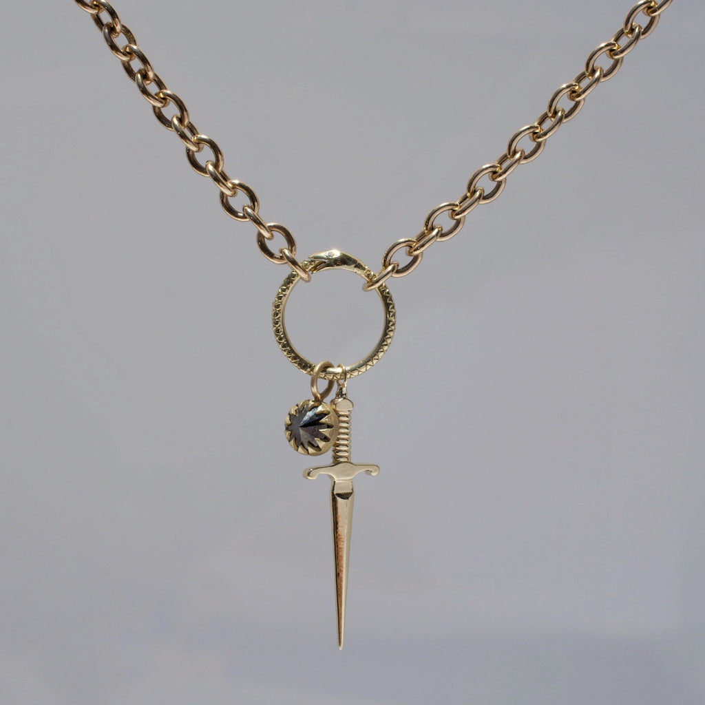 The Ouroboros Necklace has a hinged clasp that joins the tail and the mouth of the snake, creating an illusion of infinite cycling. The clasp is removable, making the ouroboros a versatile piece that can serve as a necklace closure, a charm, or an accent earring.