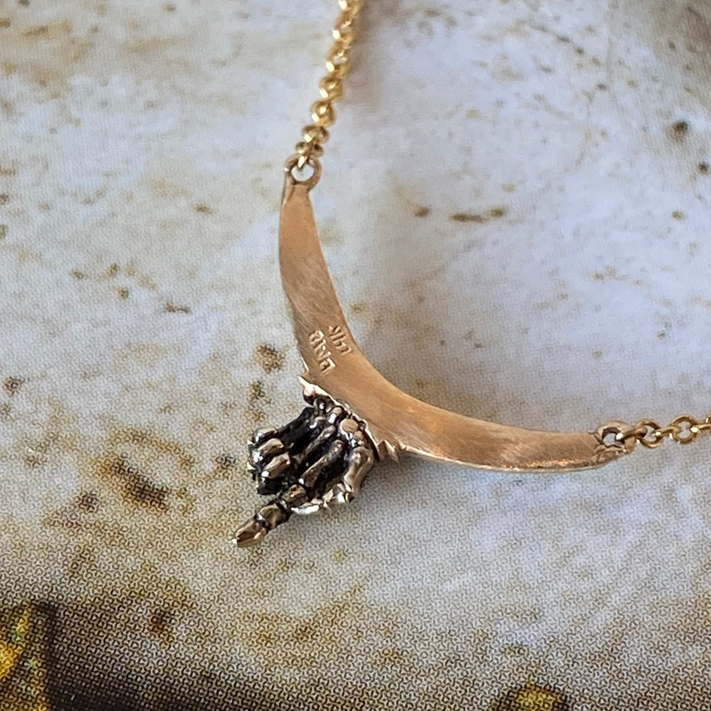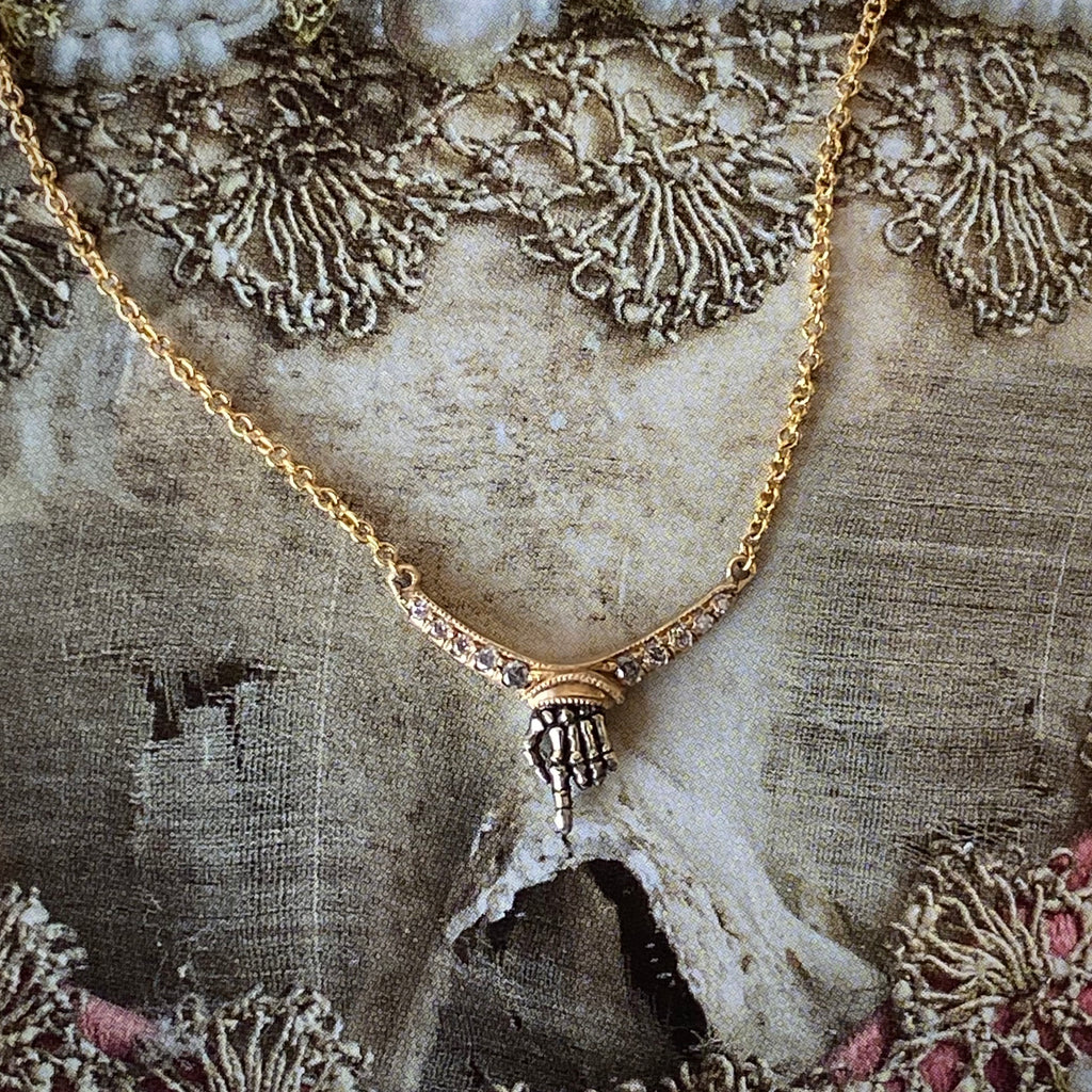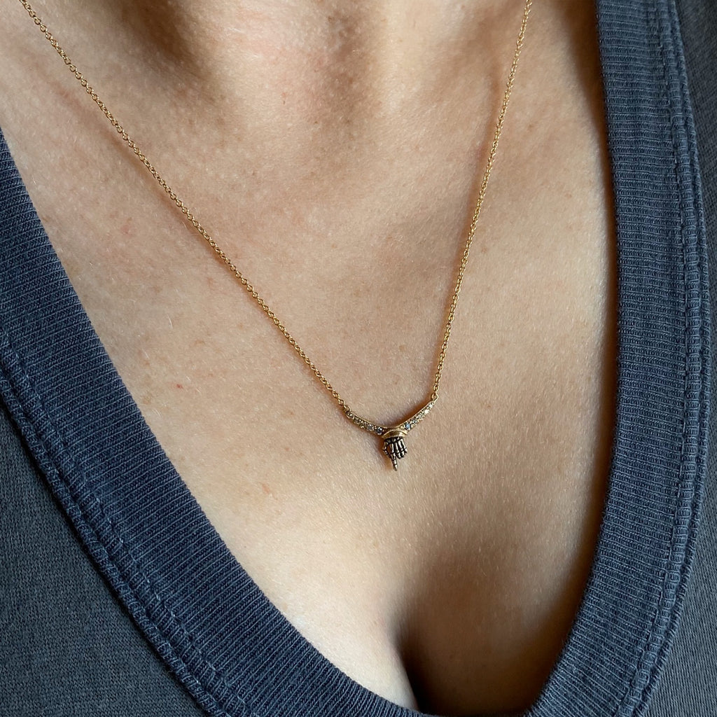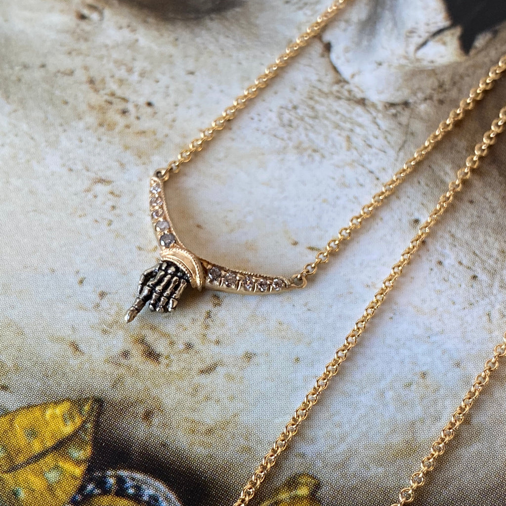 As above, so below. This incredible necklace by DMD Metal features detailed phalanges, hand-carved in the round and cast in oxidized white gold. Set below a yellow gold arch of obmre salt & pepper diamonds, the index bone outstretched reminds that you, yes you are the link between the salt of the earth and the realm of shades.