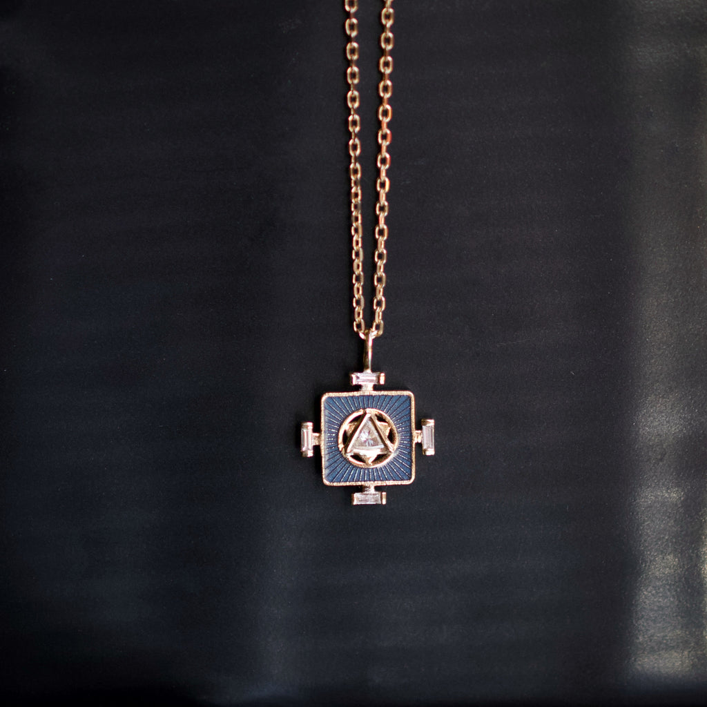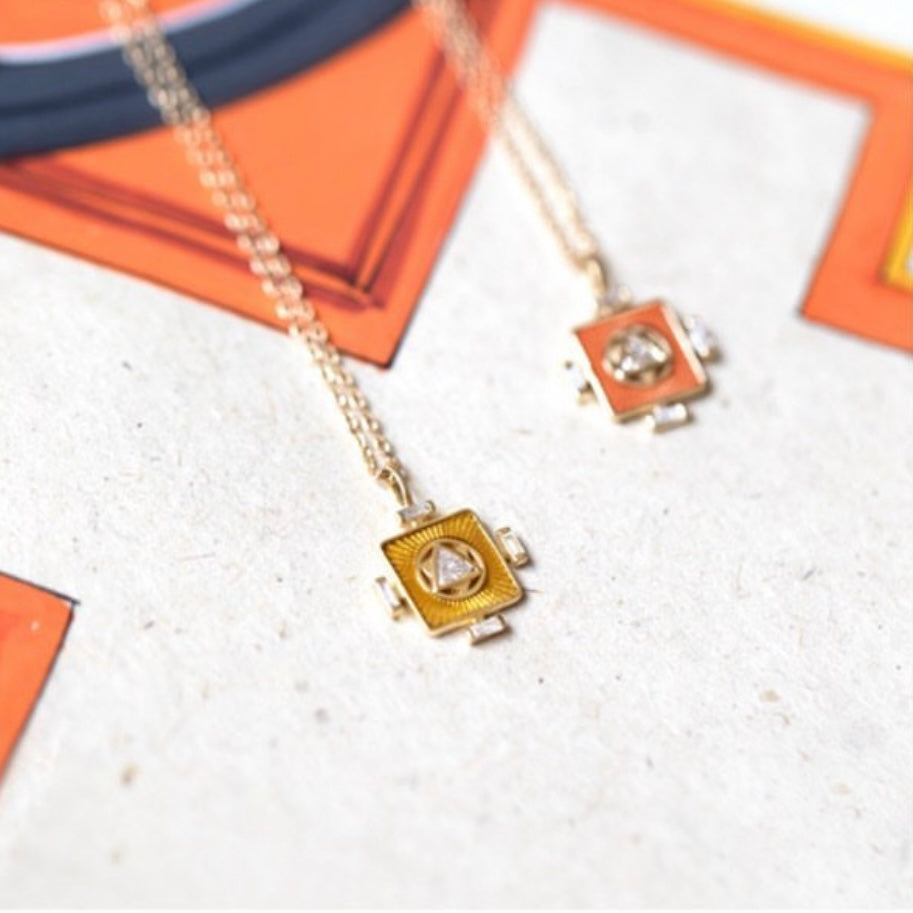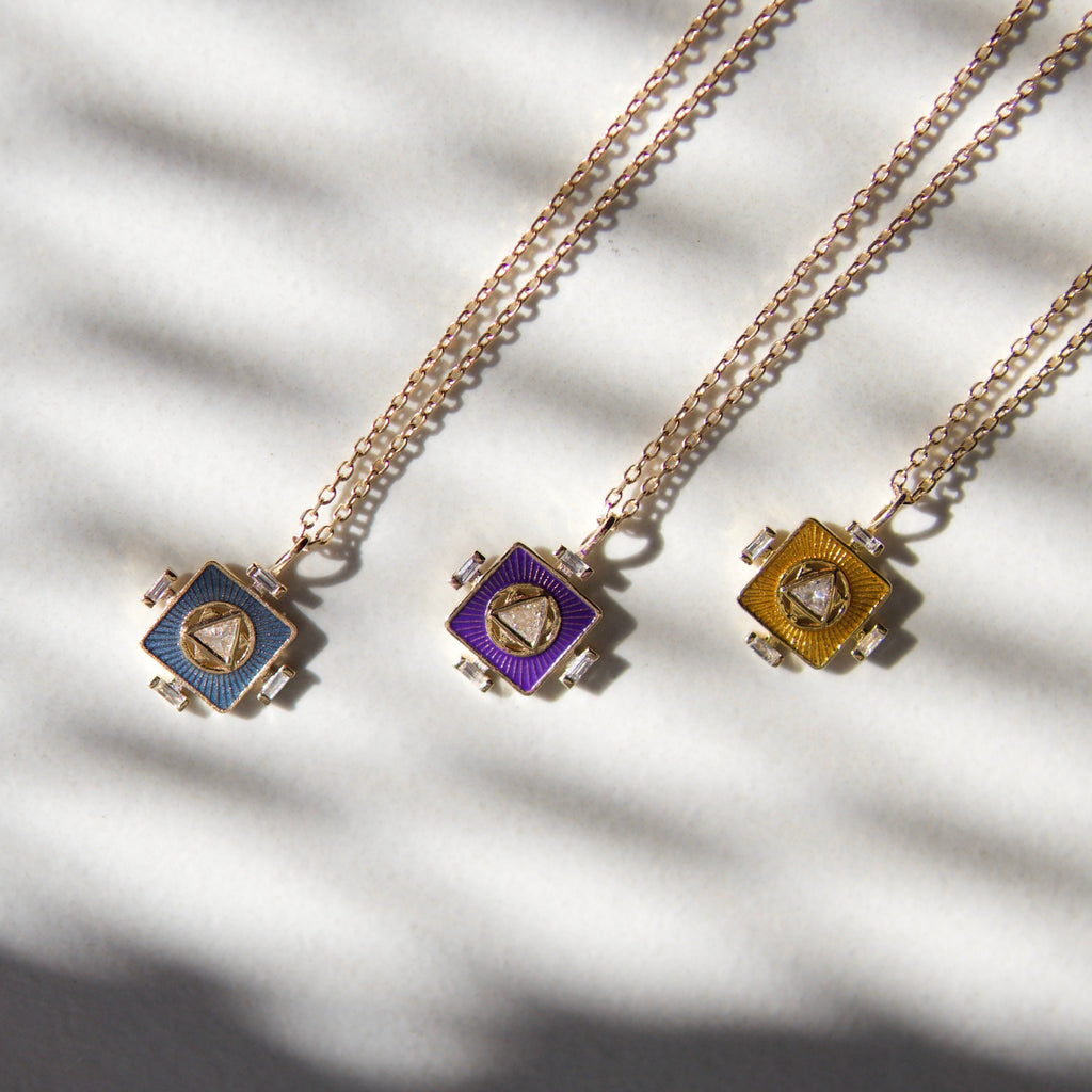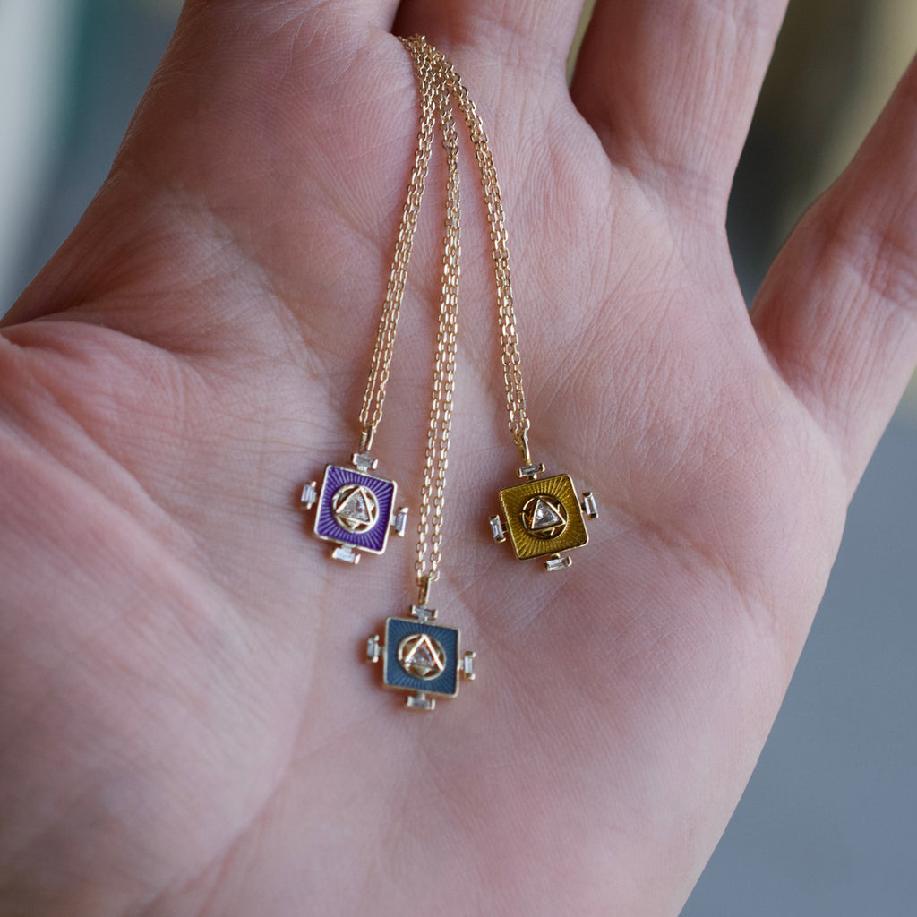 In Indian culture, yantra are the representation of the truth and are intended to reveal the secrets of the universe. Each colored pendant symbolizes an Indian Chakra. These Celine Daoust necklaces feature 14k light yellow gold chain necklace with a yantra enamel pendant set with one trillion diamond and completed with four baguette diamonds. Each pendant is colored by hand.