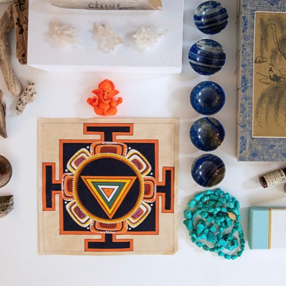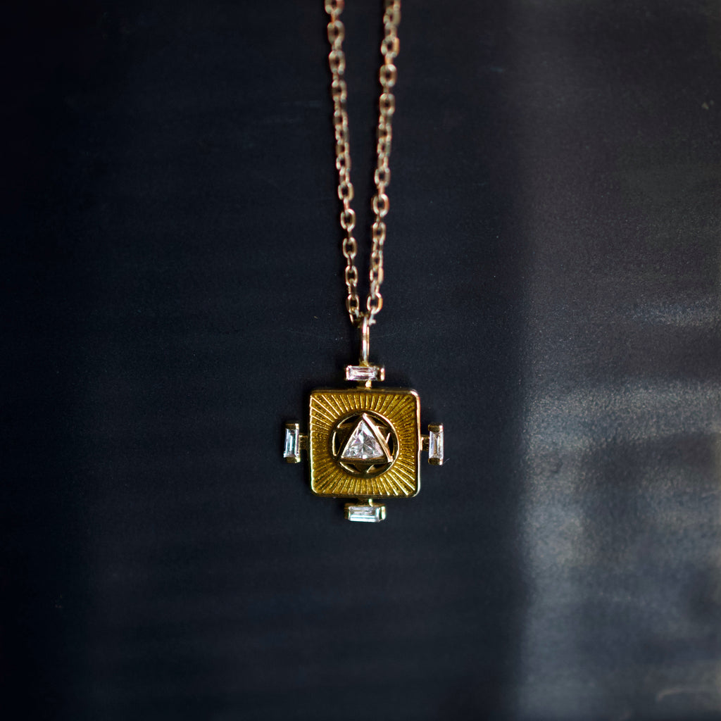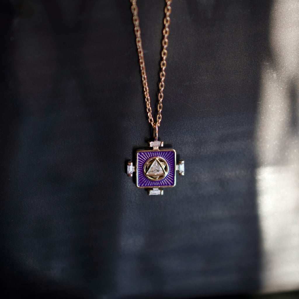 In Indian culture, yantra are the representation of the truth and are intended to reveal the secrets of the universe. Each colored pendant symbolizes an Indian Chakra. These Celine Daoust necklaces feature 14k light yellow gold chain necklace with a yantra enamel pendant set with one trillion diamond and completed with four baguette diamonds. Each pendant is colored by hand.