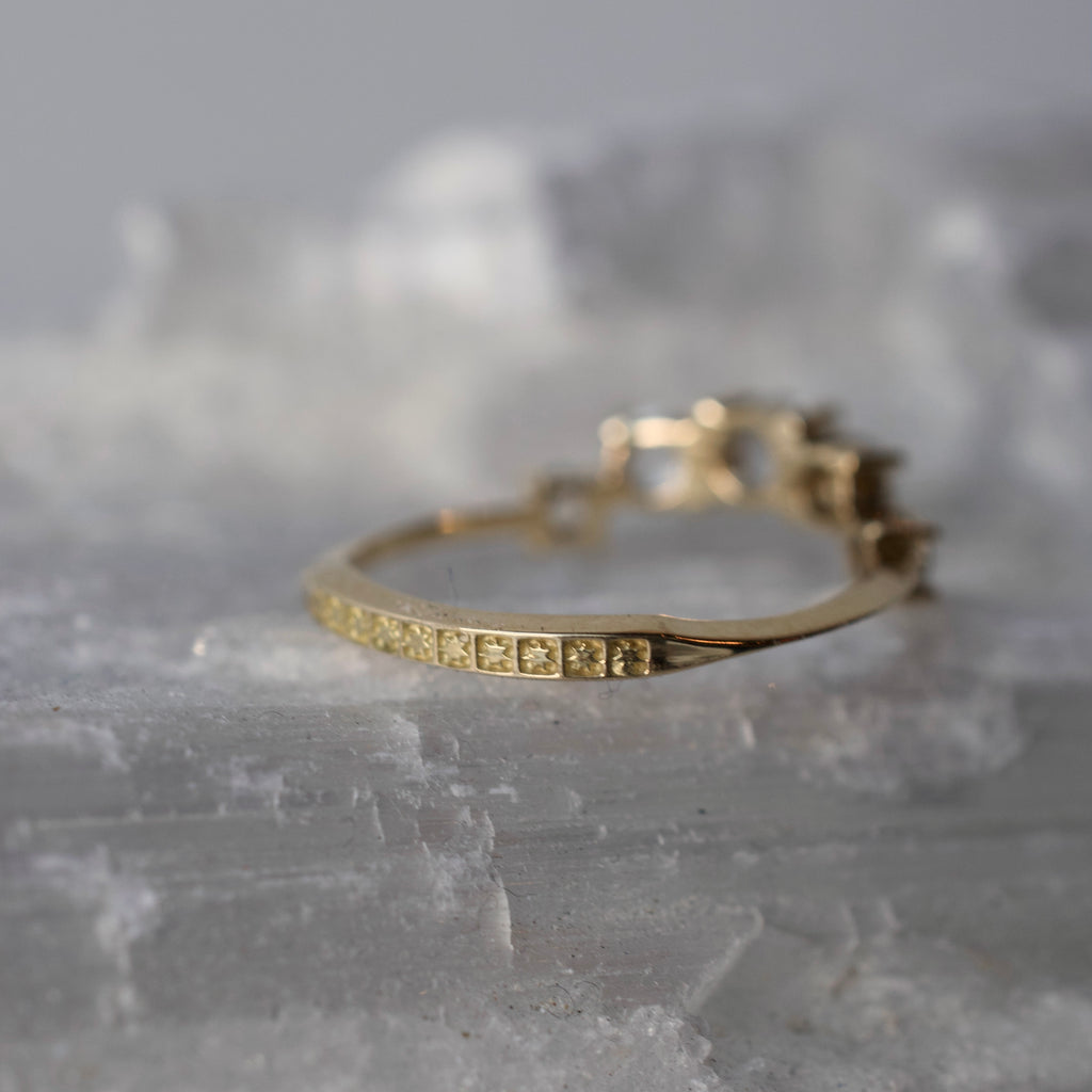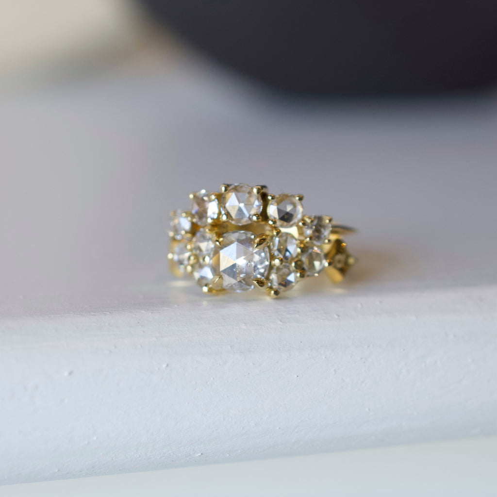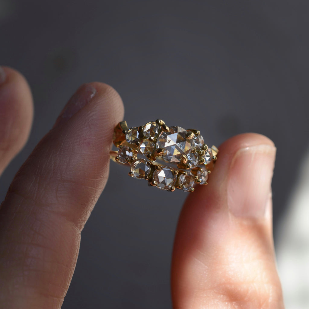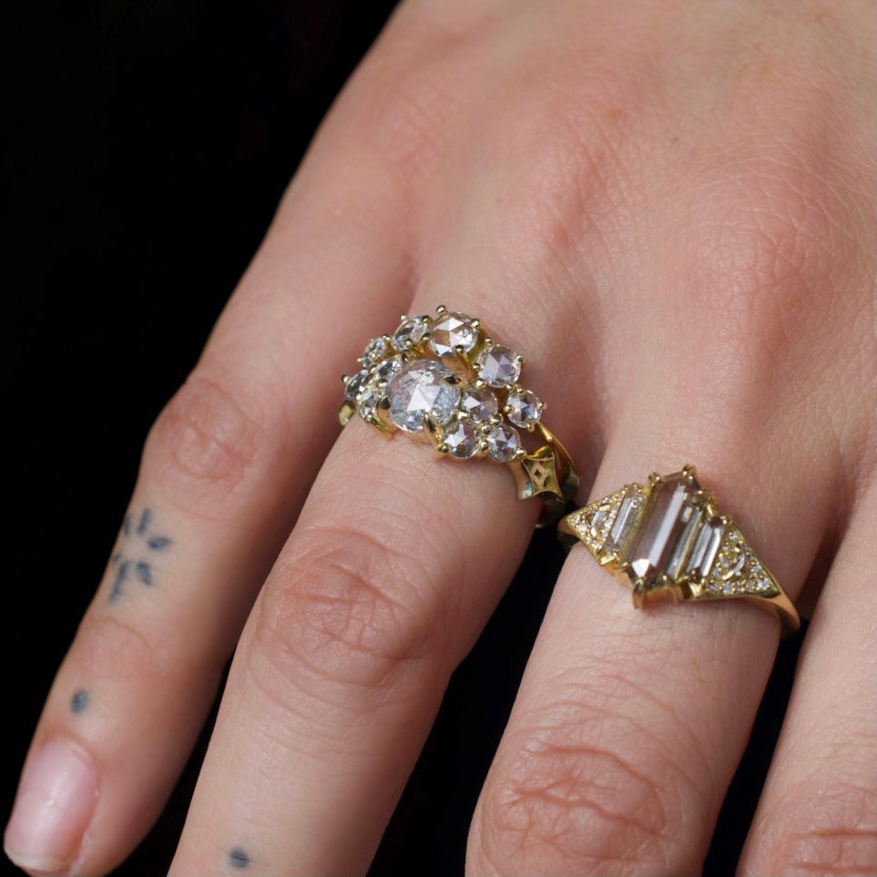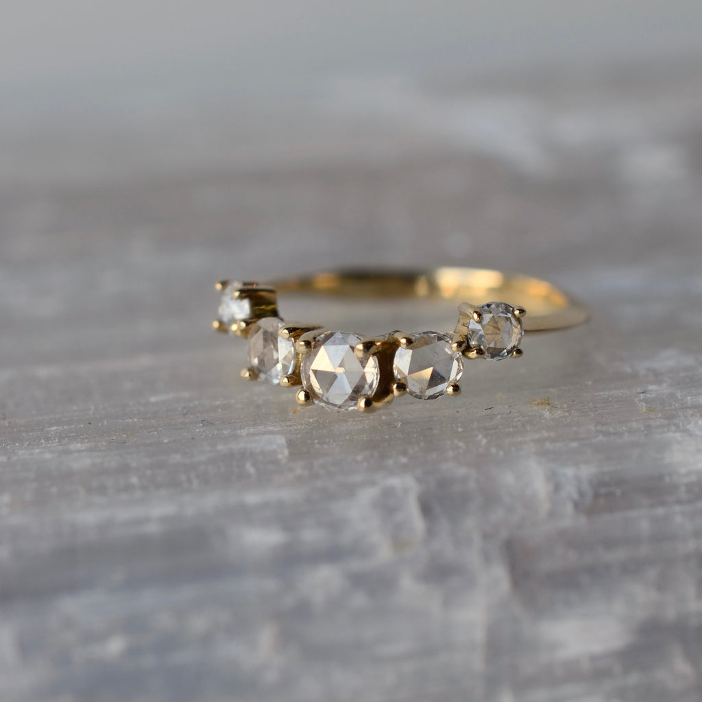 A wedding band like a coronation, this stacking ring is the complimentary crown to the breath-taking Nico. It features five rose cut white diamonds and Digby & Iona’s signature knife edge band, intricately carved and adorned, front to back, with elegant angles and undulating curves. She's sure to enhance the distinctive presence of your ceremonial stack.