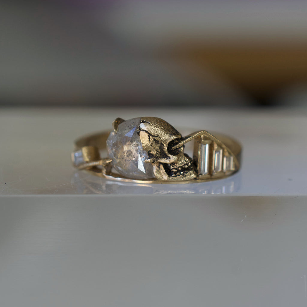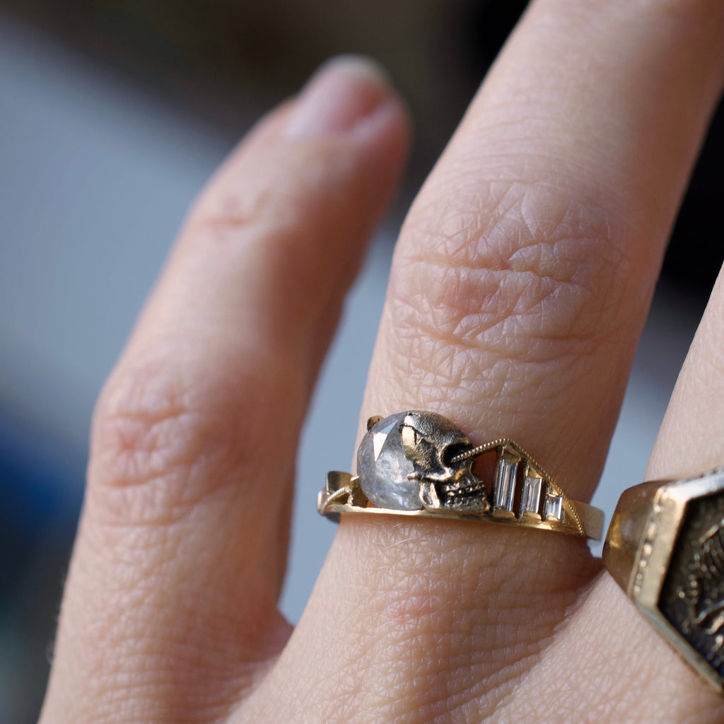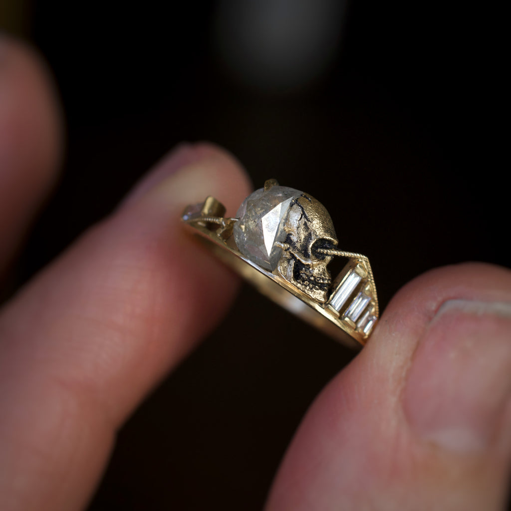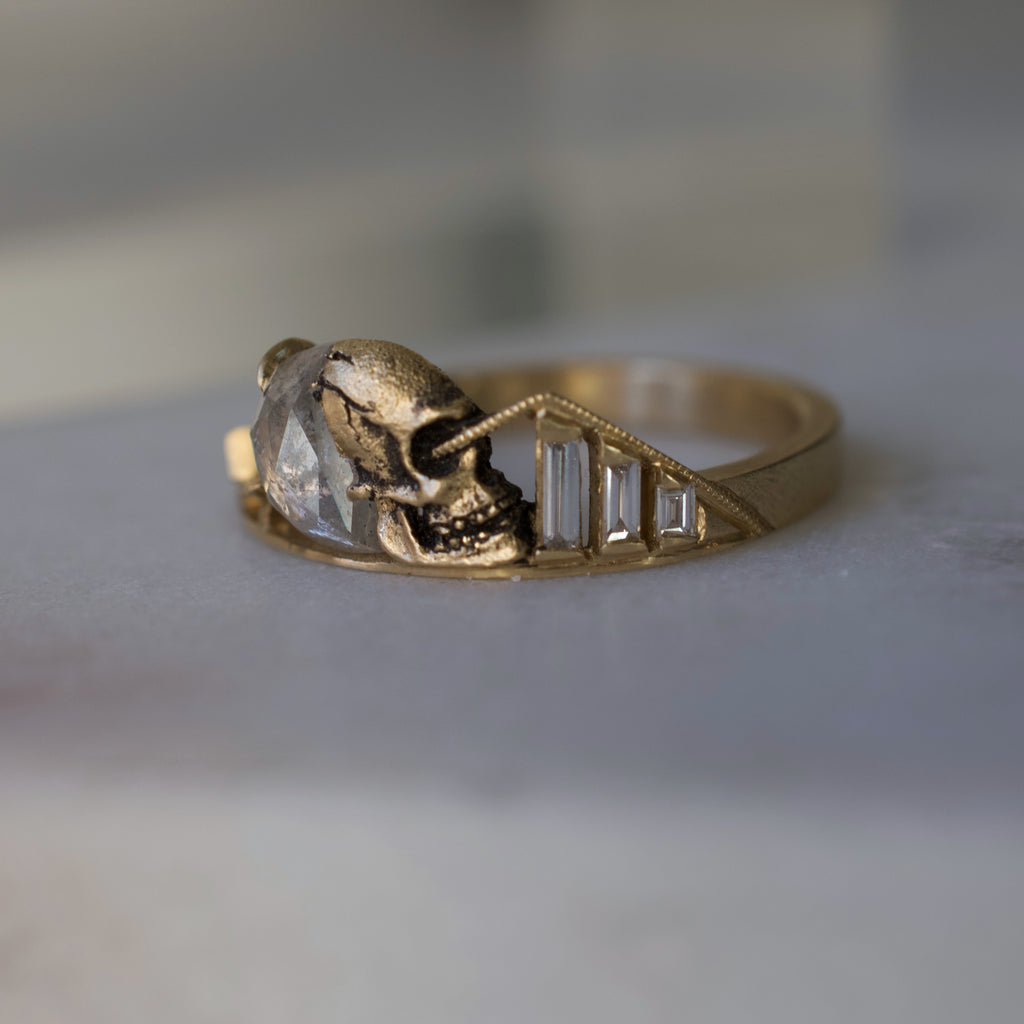 A modernized memento mori ring, that uses a half moon rose cut diamond to complete the profile of a realistically carved skull. It is set against a geometric framework of baguette diamonds that depict the rise and fall of light. The slim cigar styled band is finished with hand engraved line work and fine stippled texture.