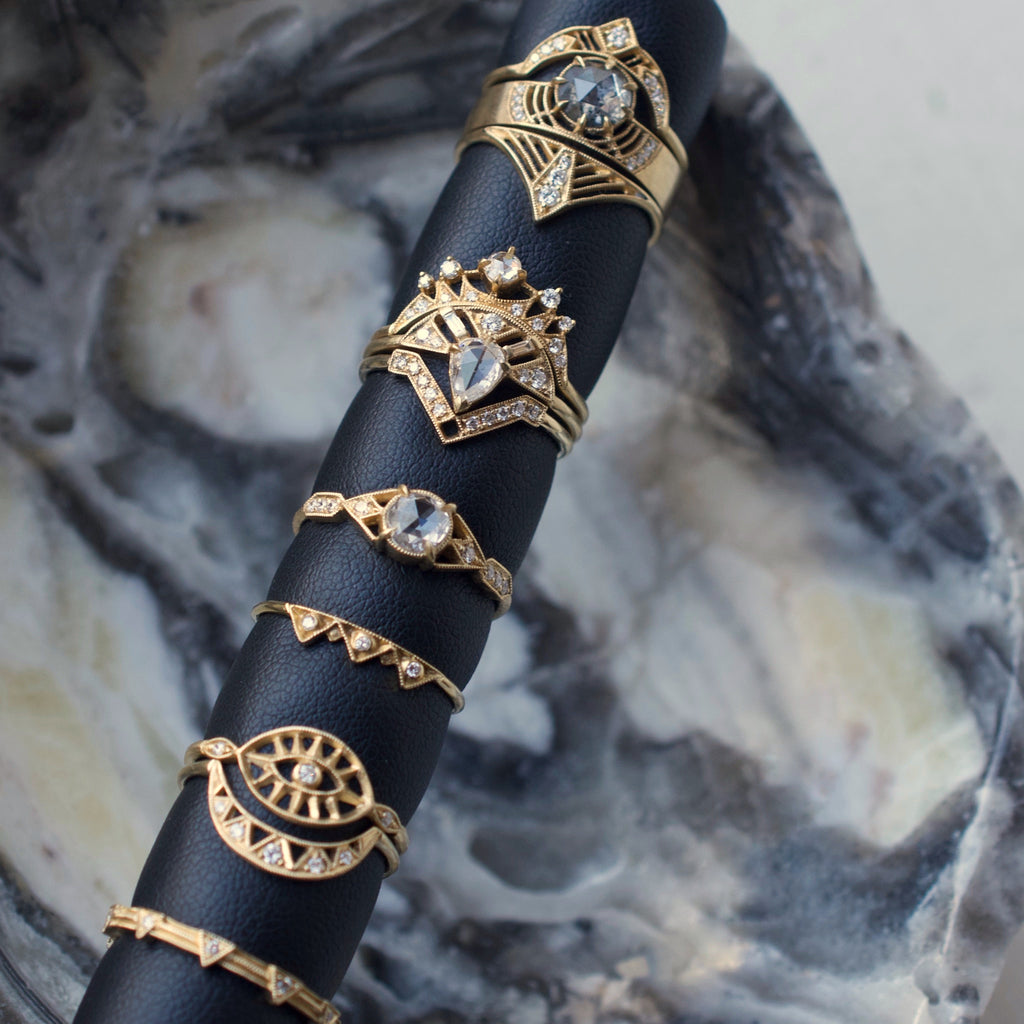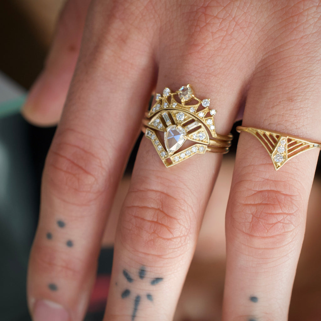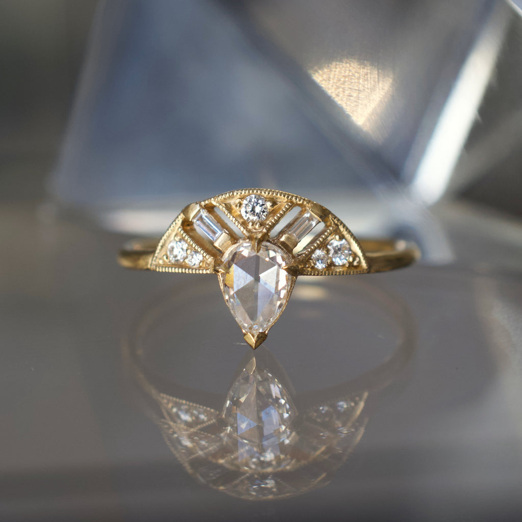 The Leanne ring featuring a 4x6mm pear shape rose cut diamond and a little extra diamond armor with 2 baguettes and diamond melee. The semicircle halo allows for stacking potential on each side.