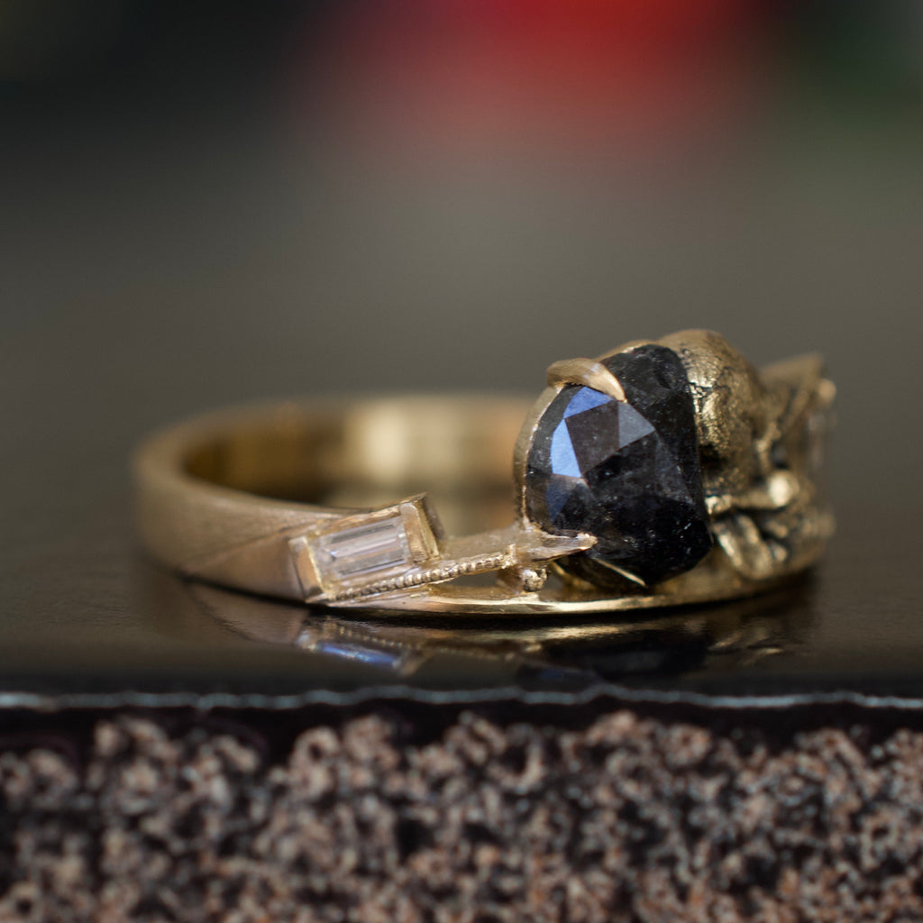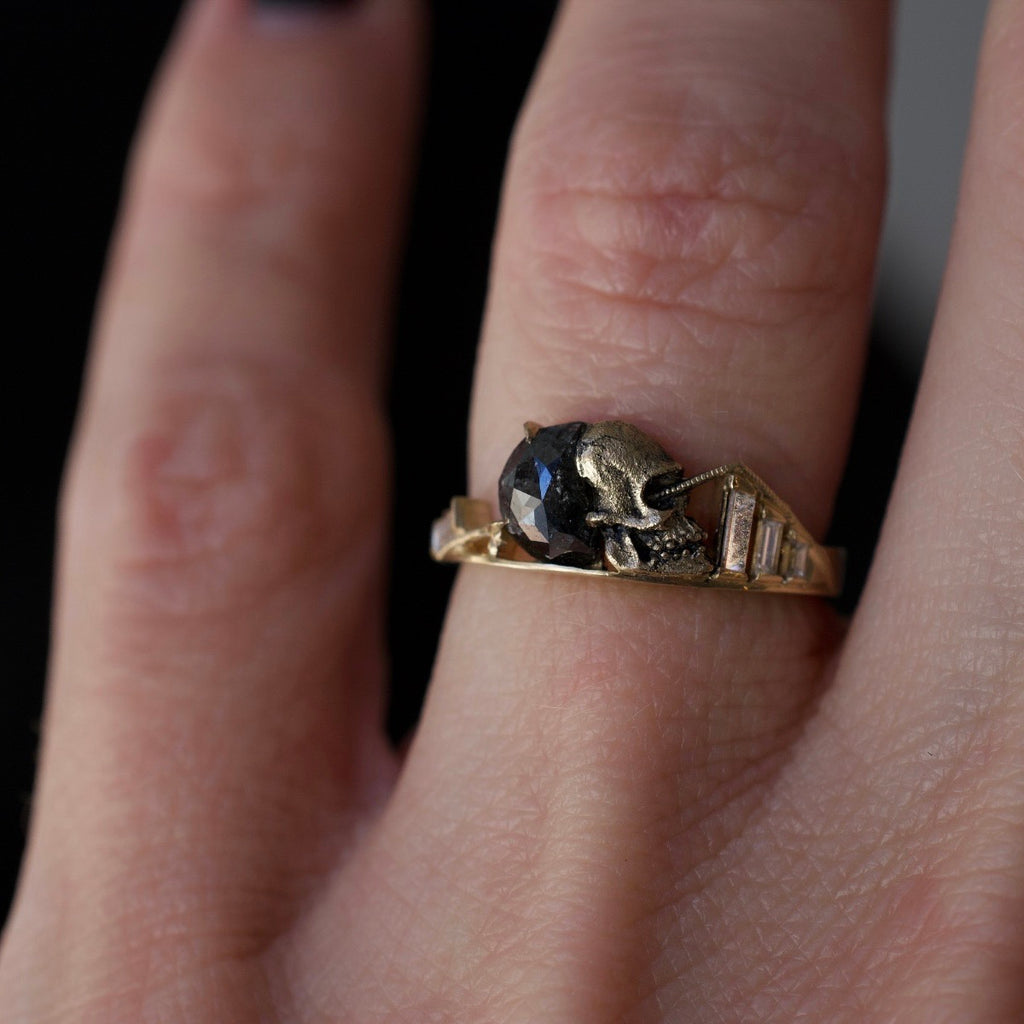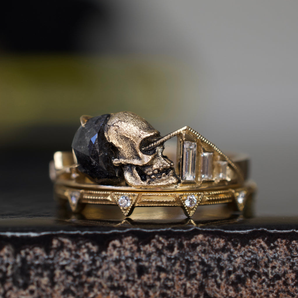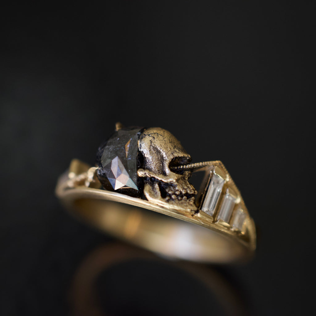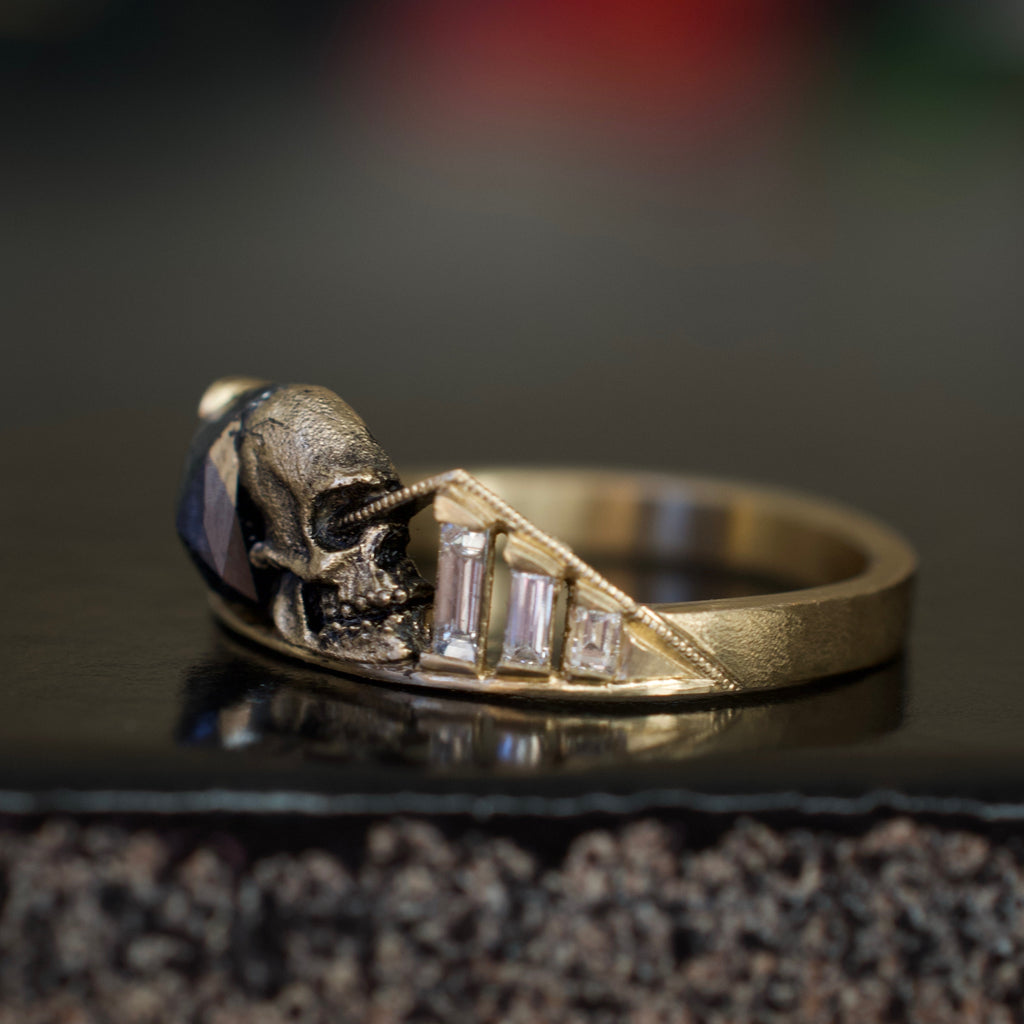 A modernized memento mori ring, that uses a half moon rose cut diamond to complete the profile of a realistically carved skull. It is set against a geometric framework of baguette diamonds that depict the rise and fall of light. The slim cigar styled band is finished with hand engraved line work and fine stippled texture.