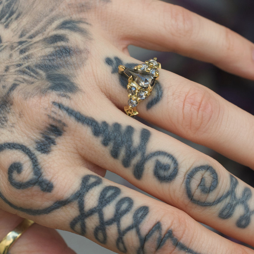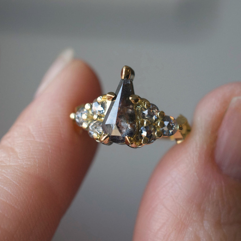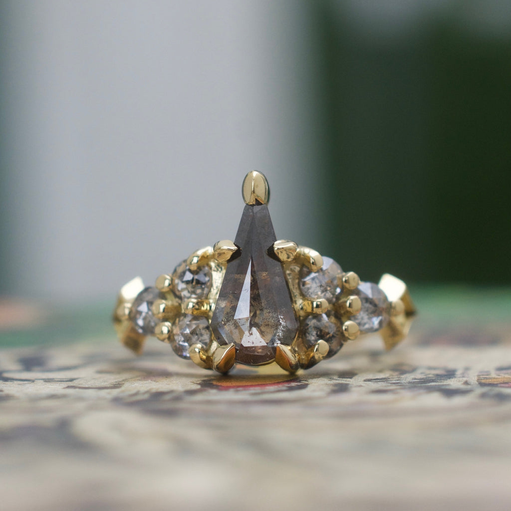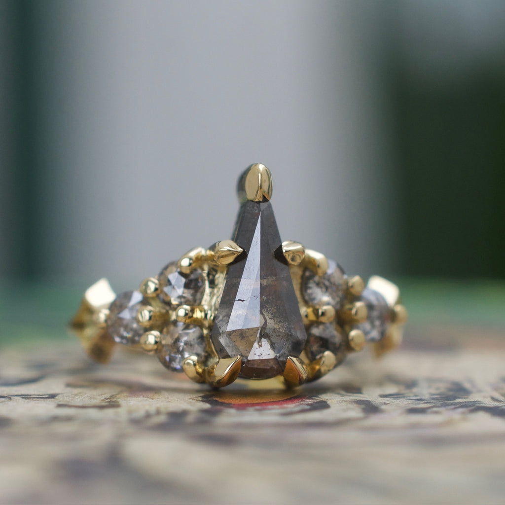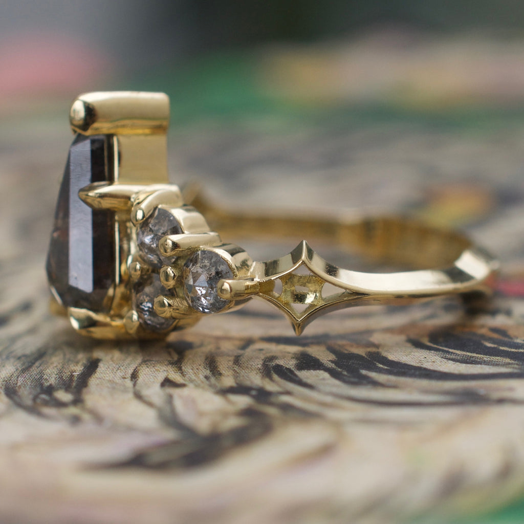 There's no mistaking a Nico. Nico is stunning. Nico is legendary. Complimented by the signature blossoms of a triad of rose cut diamonds on each side, this one of kind Nico features a unique cut Salt & Pepper pear/kite shaped diamond. Enthroned like a palace built for a queen, the gilded band is intricately carved and adorned, front to back, with elegant angles and undulating curves--each element a nod to Digby & Iona's signature craftsmanship.
