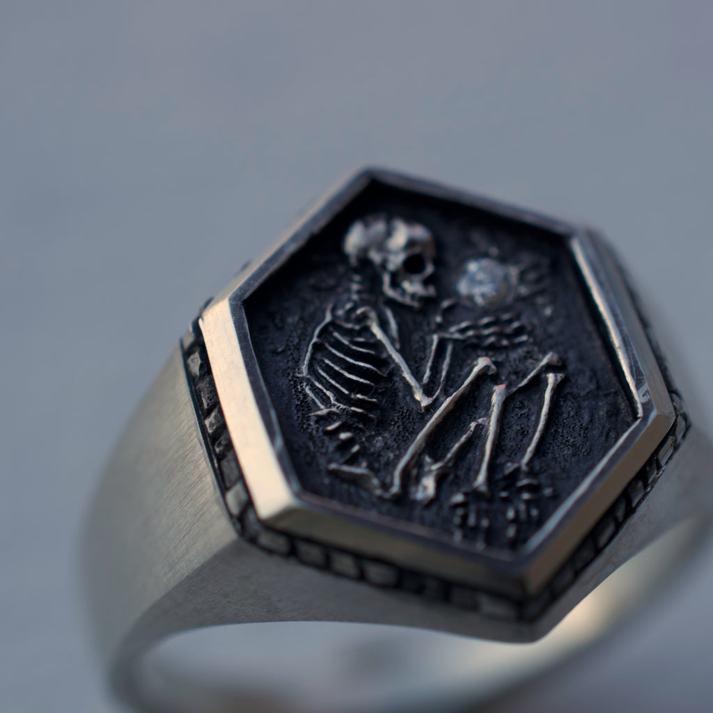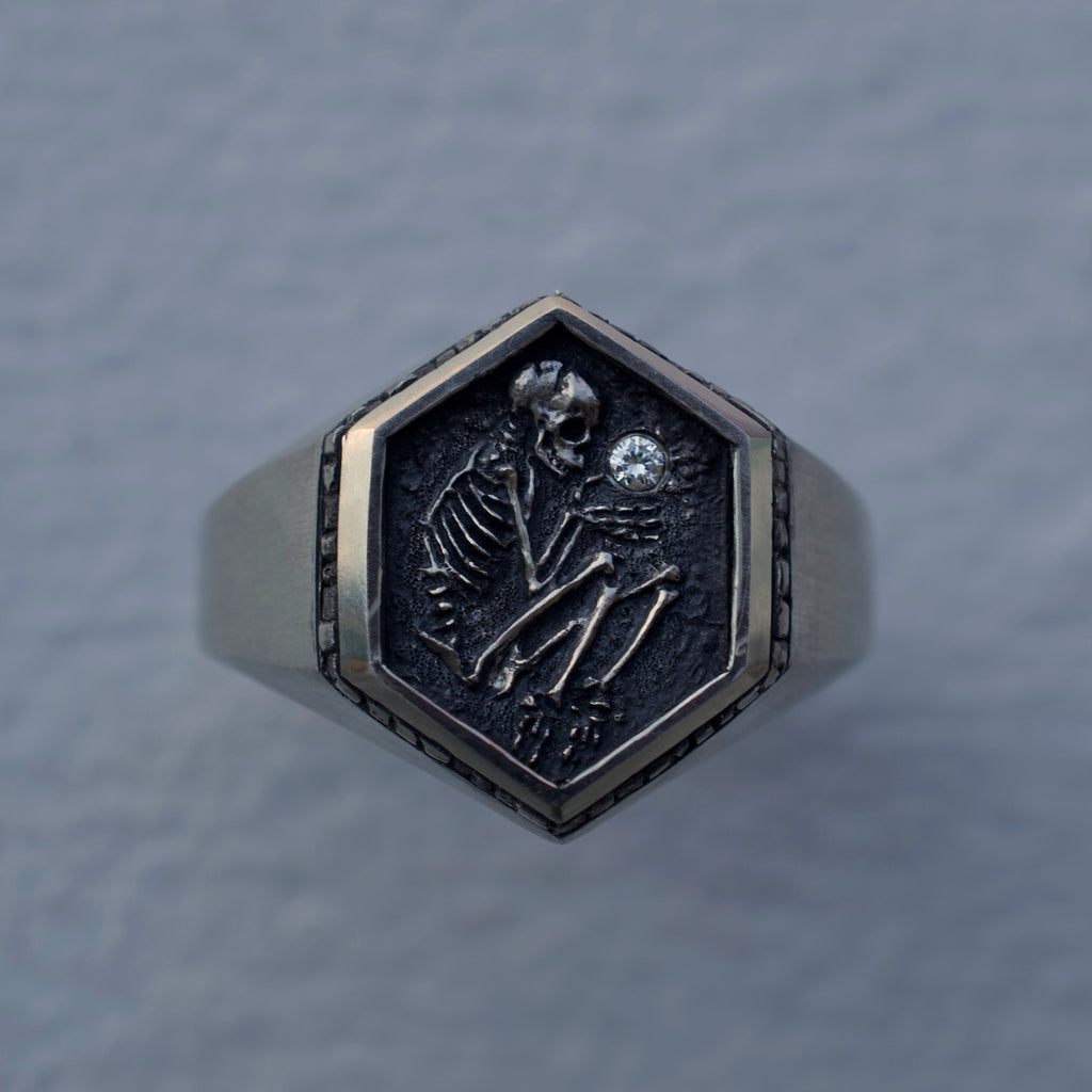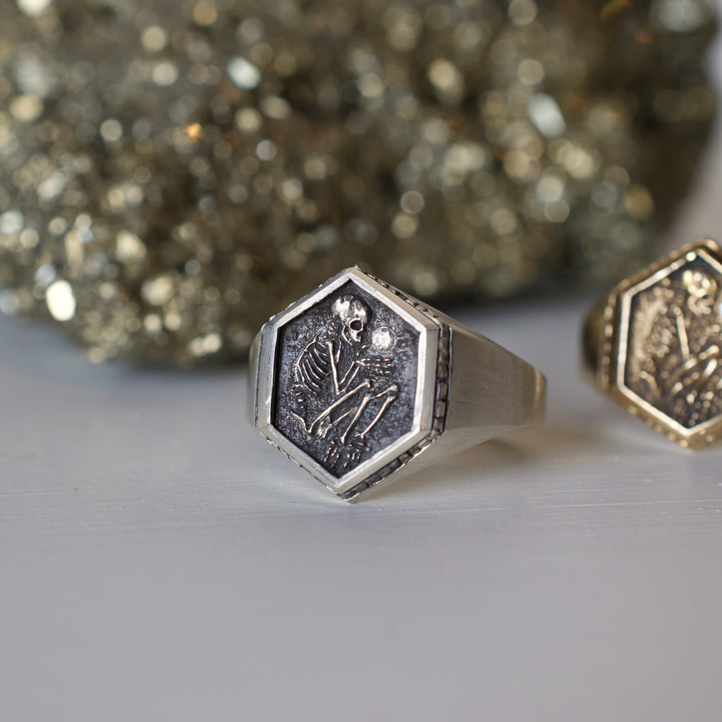 A Memento Mori depicted in the shallow grave. A tiny excavated skeleton— half in, half out. The precious commodity of time is always slipping through our fingers. This ring is a tiny reminder— diamonds, like finer things in life, you cant take with you. Time is short, live it up.