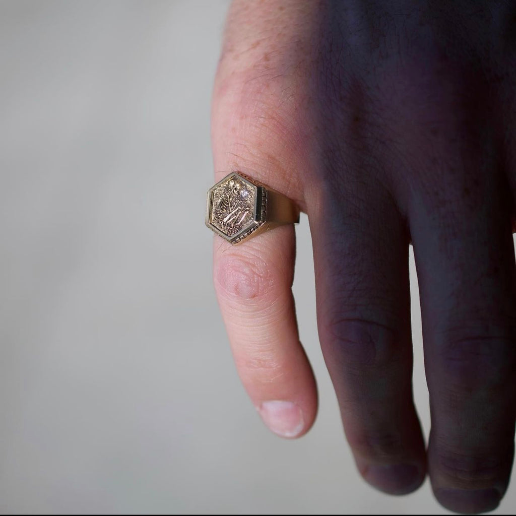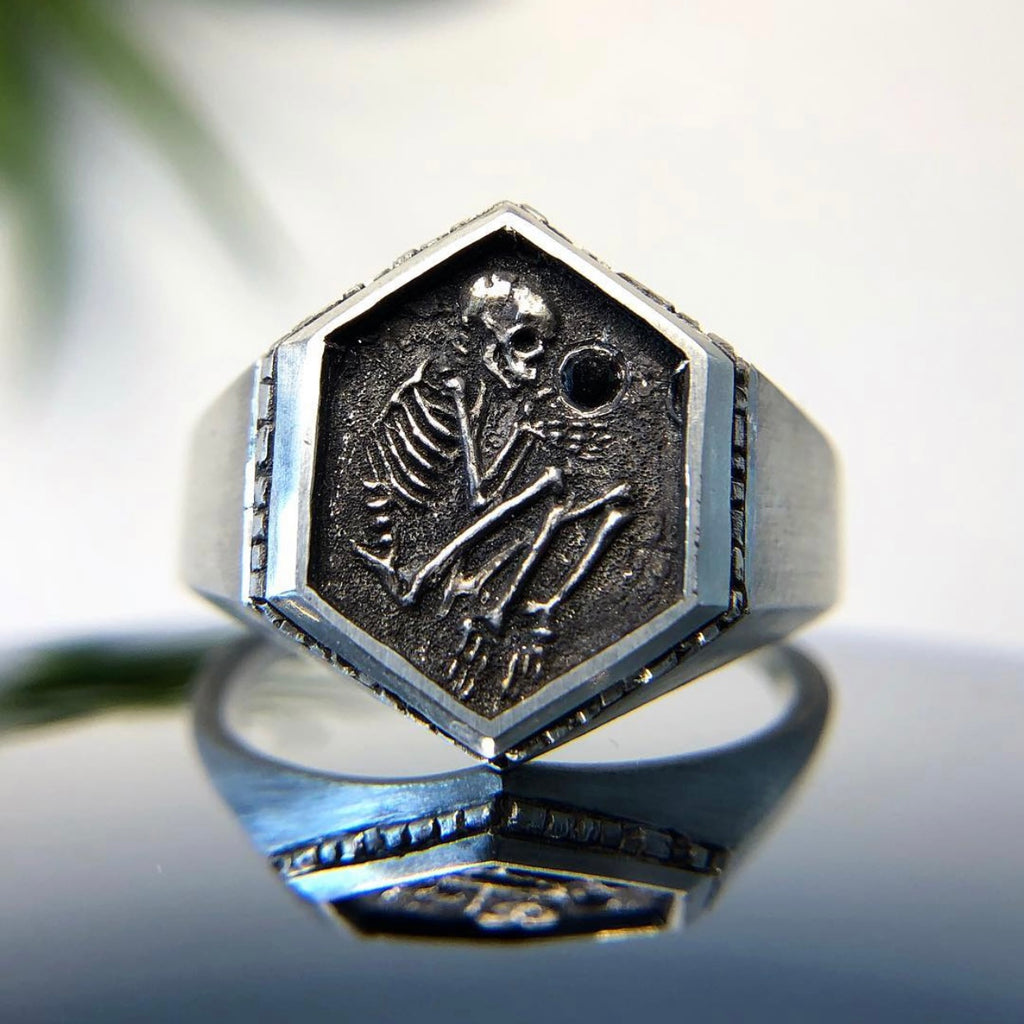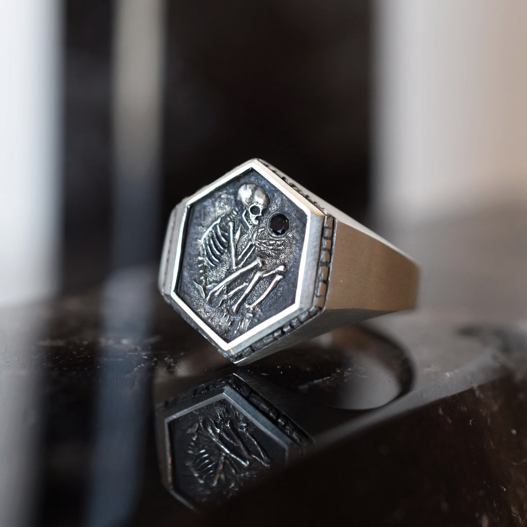 A Memento Mori depicted in the shallow grave. A tiny excavated skeleton— half in, half out. The precious commodity of time is always slipping through our fingers. This ring is a tiny reminder— diamonds, like finer things in life, you cant take with you. Time is short, live it up.