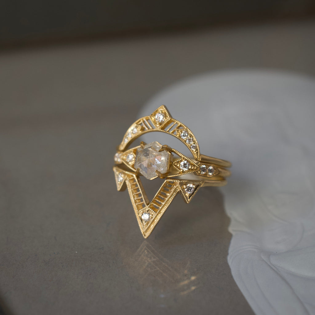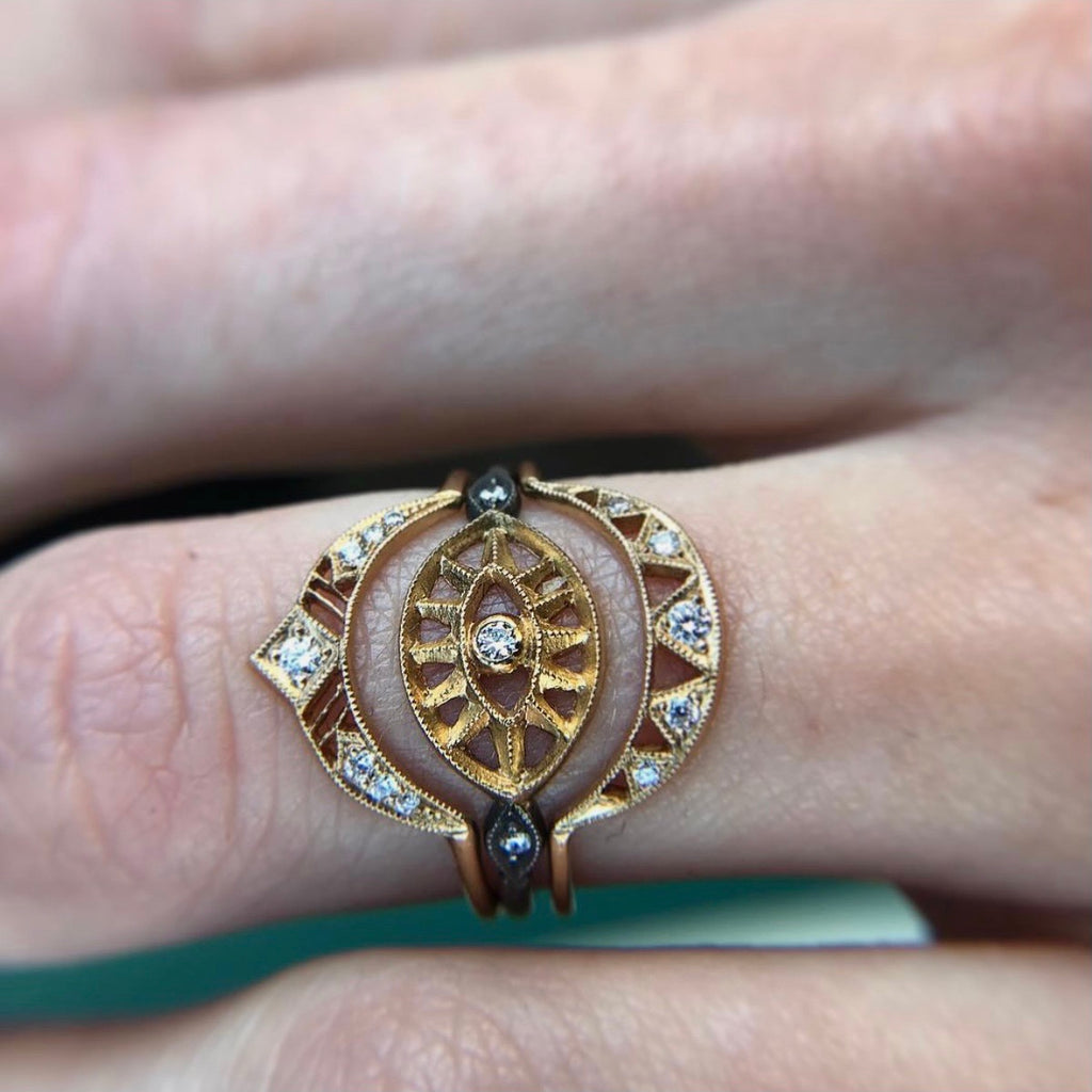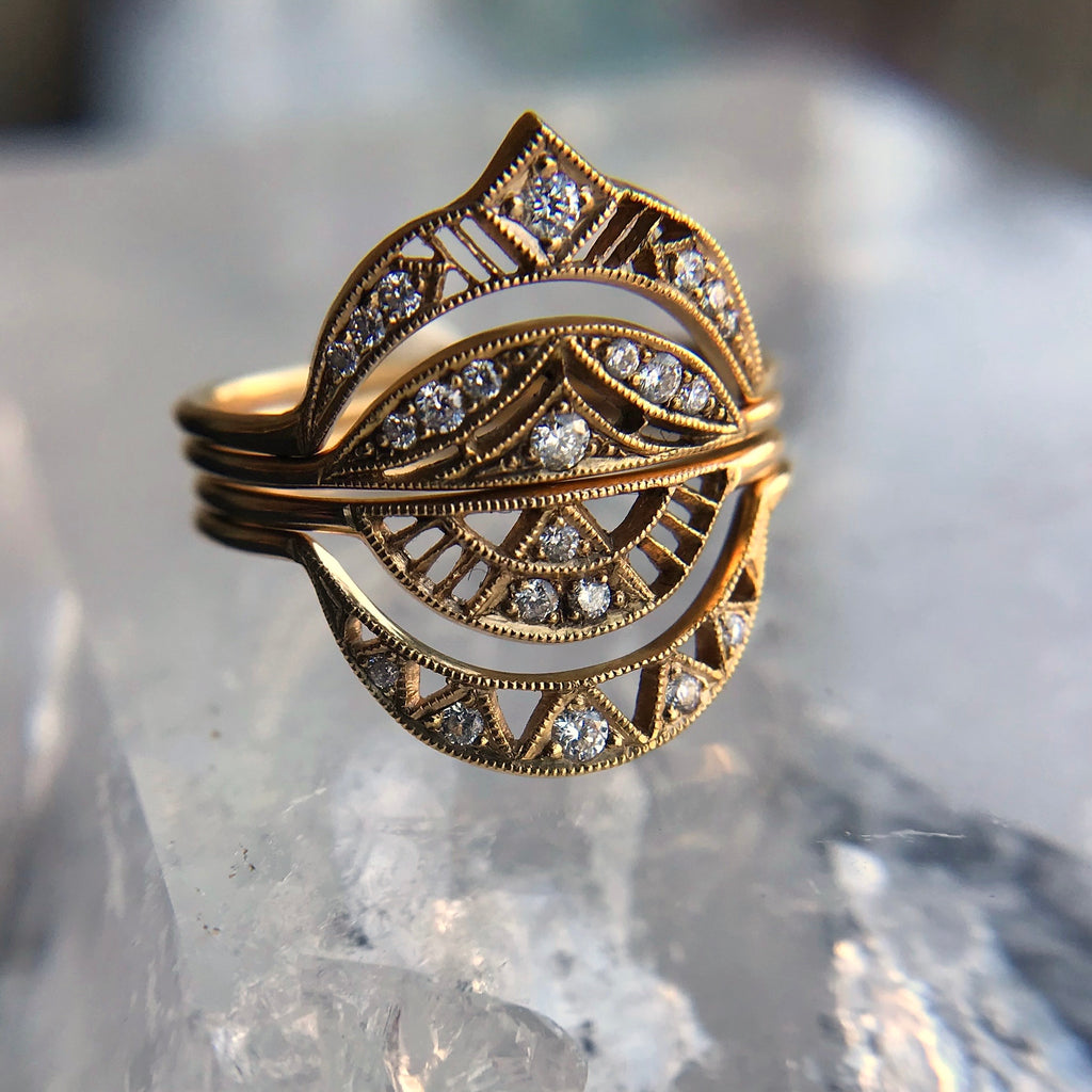 This delicate crescent shape ring is flanked by graduated diamond pave ends widening to a larger diamond setting. This ring can be the golden parenthesis to a stacking ring statement or a singular tiara for your royal digits.