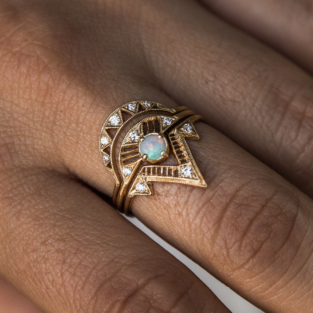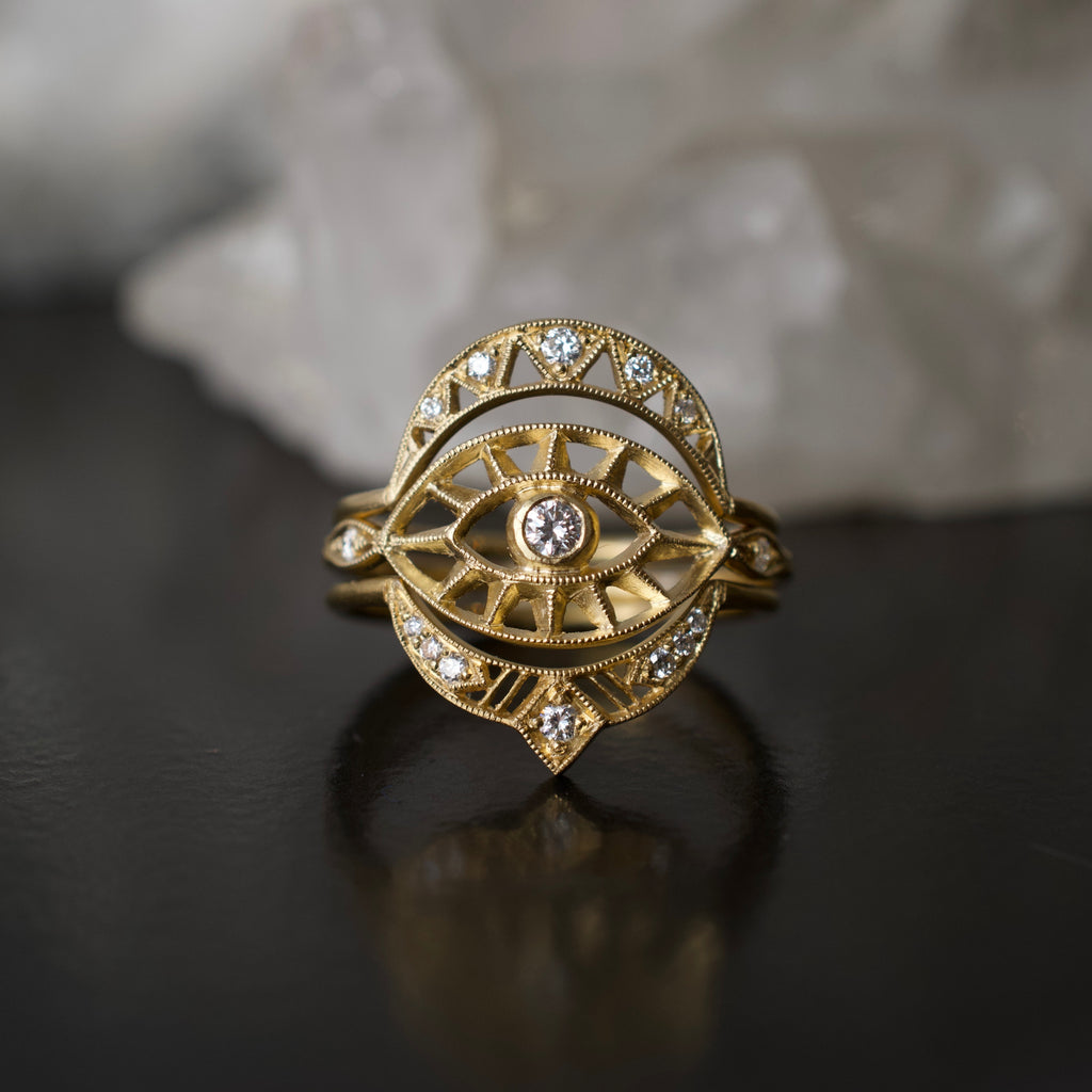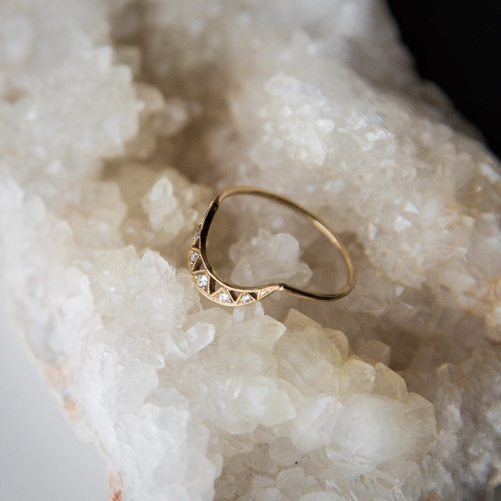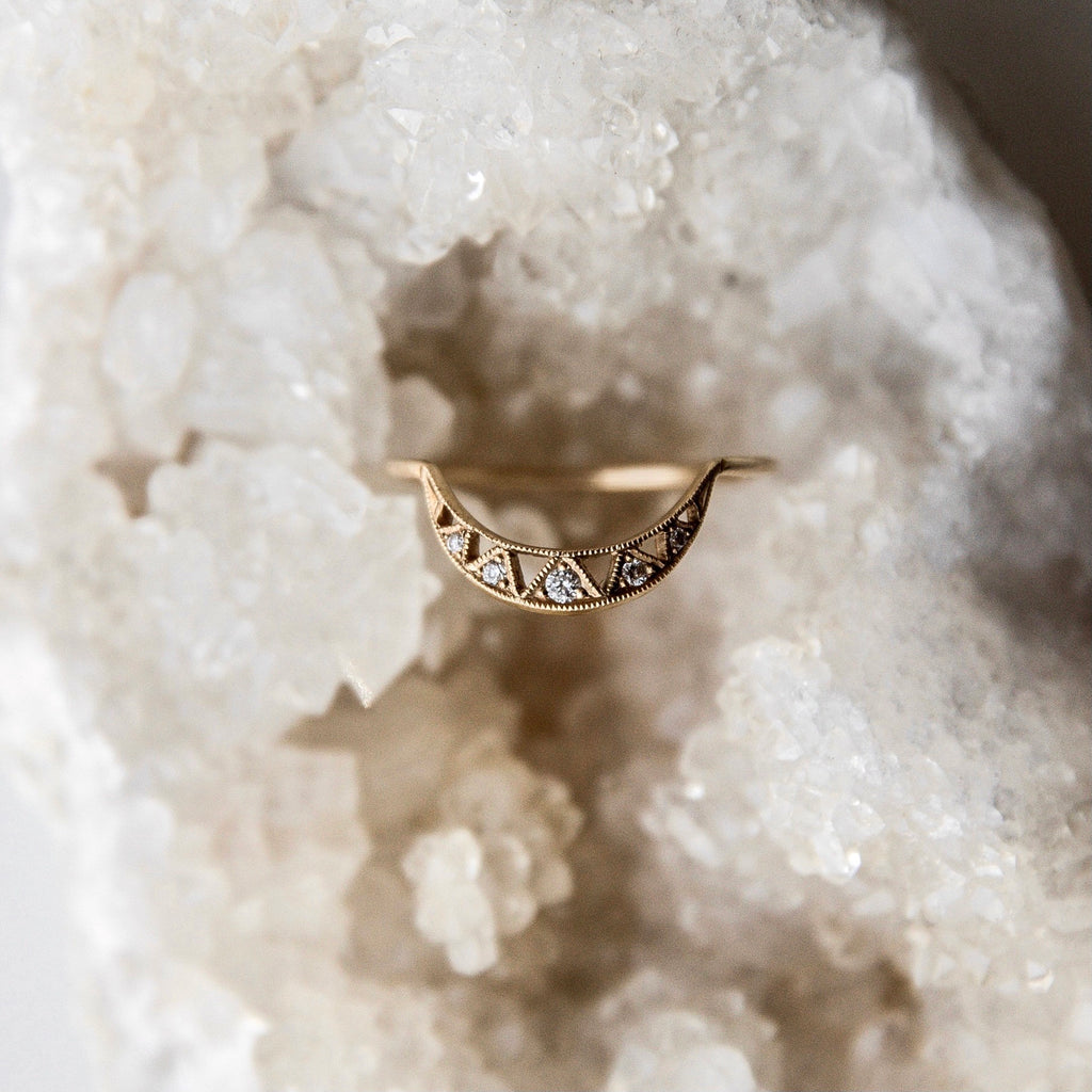 This beautiful curved stackable 14k yellow gold hand made ring by DMD Metal features 5 petite diamonds set elegantly along the curve of the ring. A crescent-shaped top with five small diamonds in bright settings. This ring can rein in a group of others under its deco arches or simply hang by itself. Put two together to frame a statement ring or just a single punctuation for a stack.