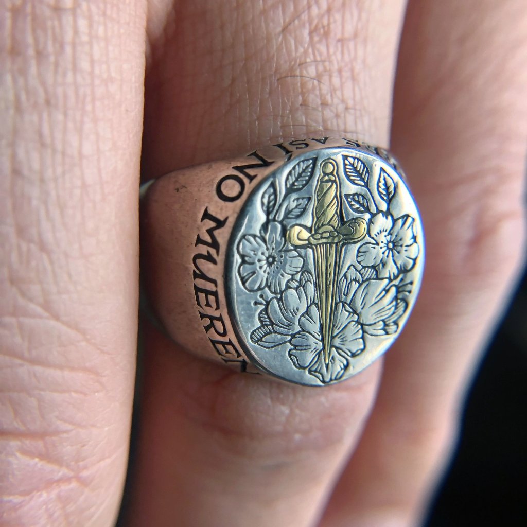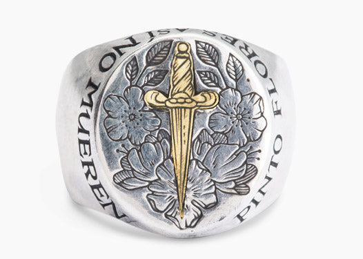 The signet reads 'Pinto Flores Asi No Mueren' which translates to 'I paint the flowers so they will not die' from the famous quote by Frida Kahlo. The signet is available in solid oxidized sterling silver or with a solid 14k yellow gold inlaid dagger.