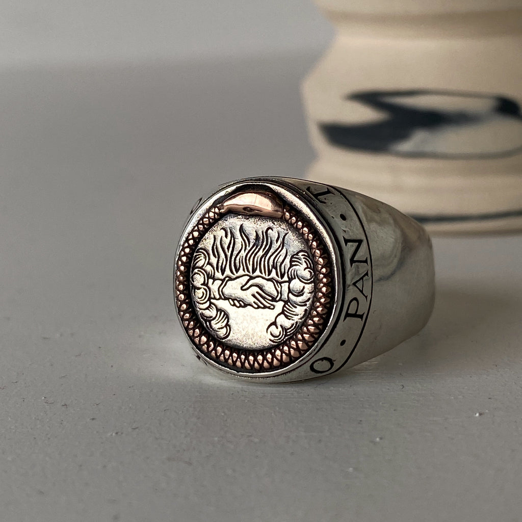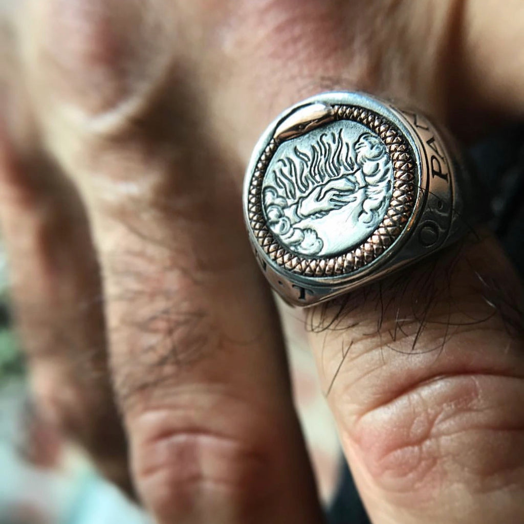 The Ouroboros Signet is oxidized sterling silver with a 14k recycled rose gold snake inset into the top. The words 'Hen To Pan' encircle to the edge of the ring which translate to 'One Is The All' and was the text found with a famous early alchemical illustration of the ouroboros.