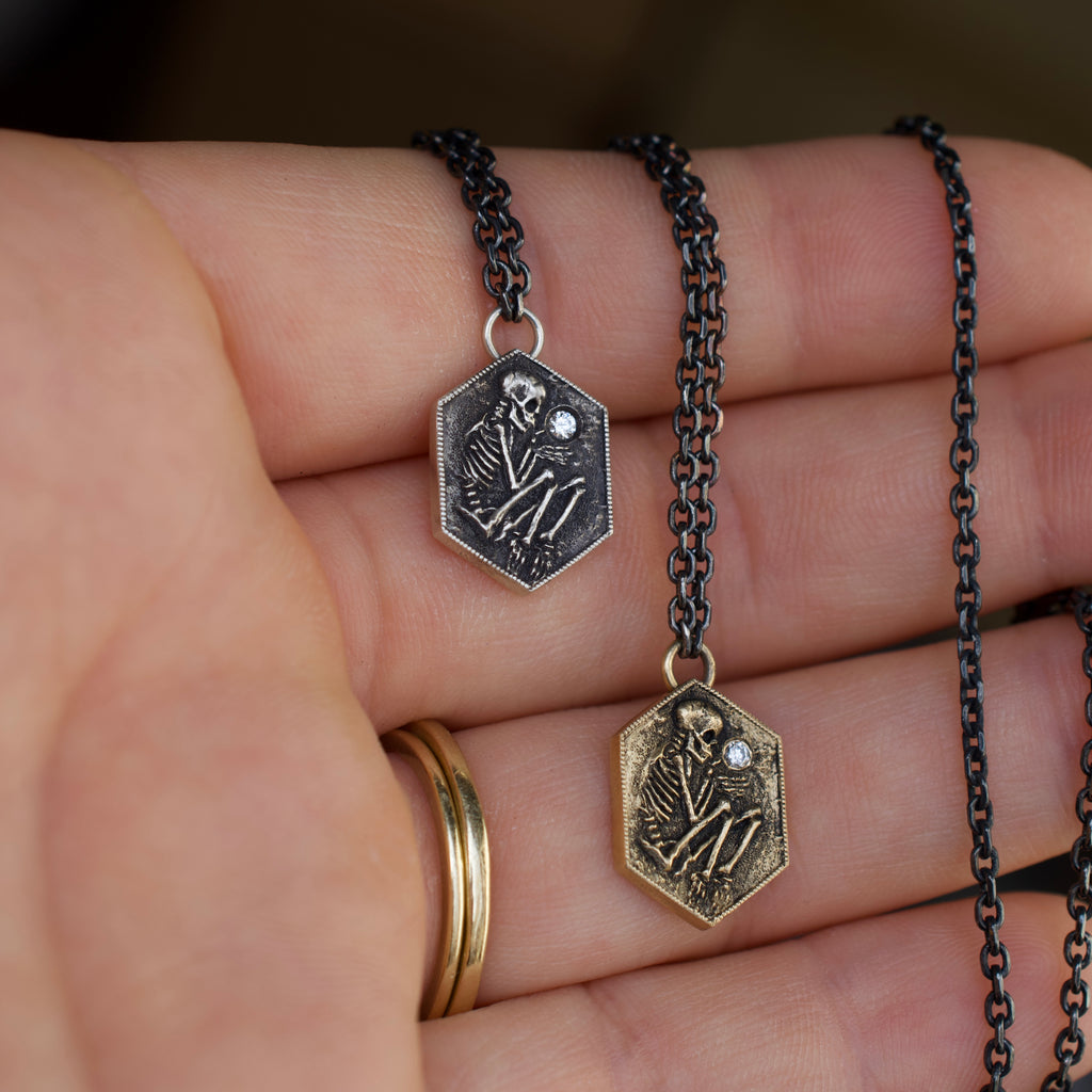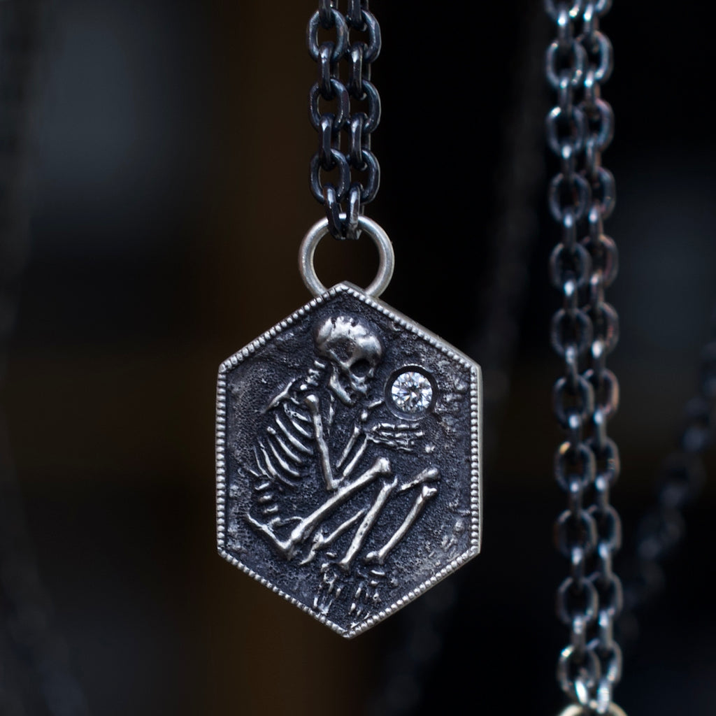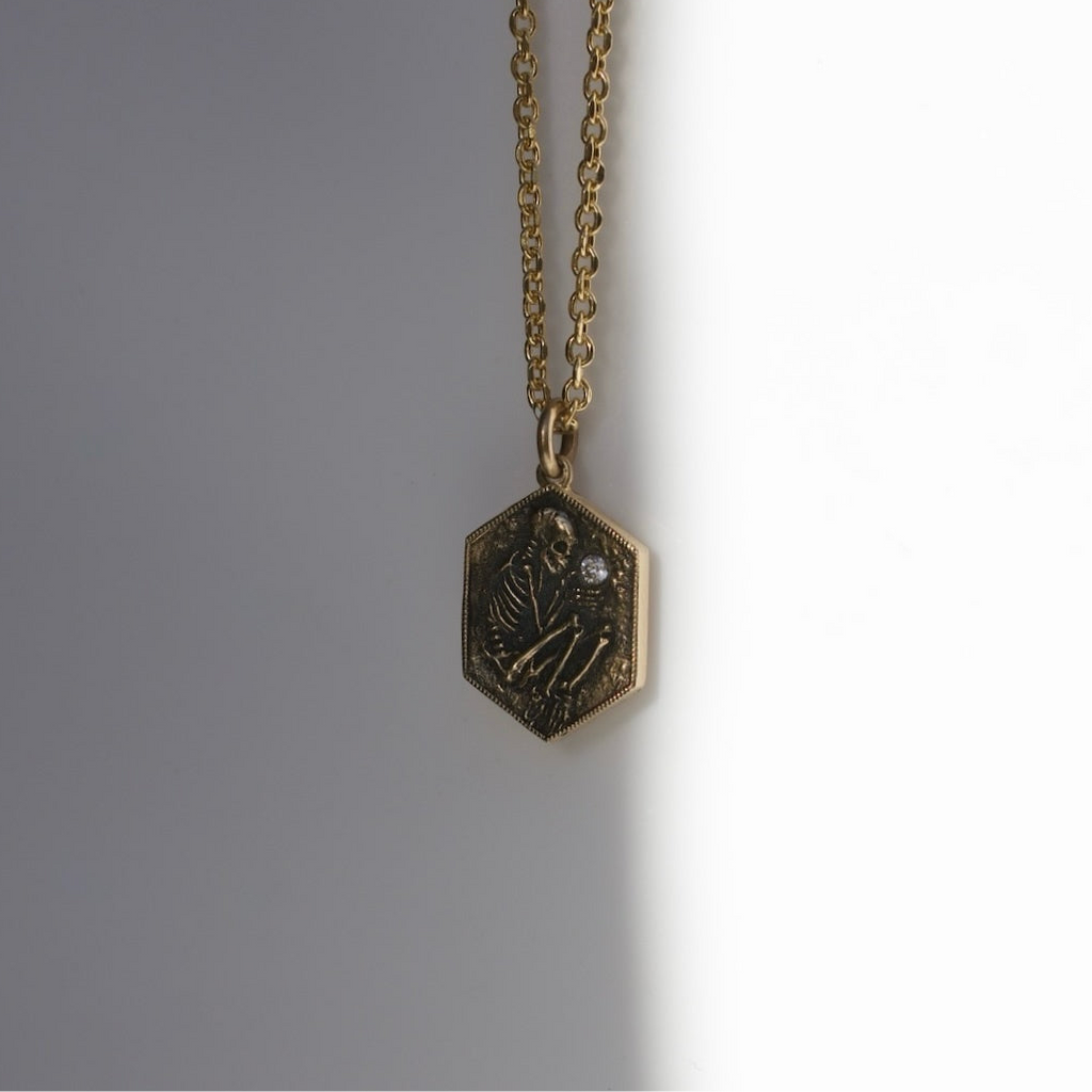 A Memento Mori depicted in the shallow grave. A tiny excavated skeleton— half in, half out. The precious commodity of time is always slipping through our fingers. This pendant is a tiny reminder- diamonds, like finer things in life, you cant take with you. Time is short, live it up.