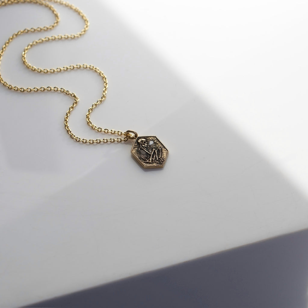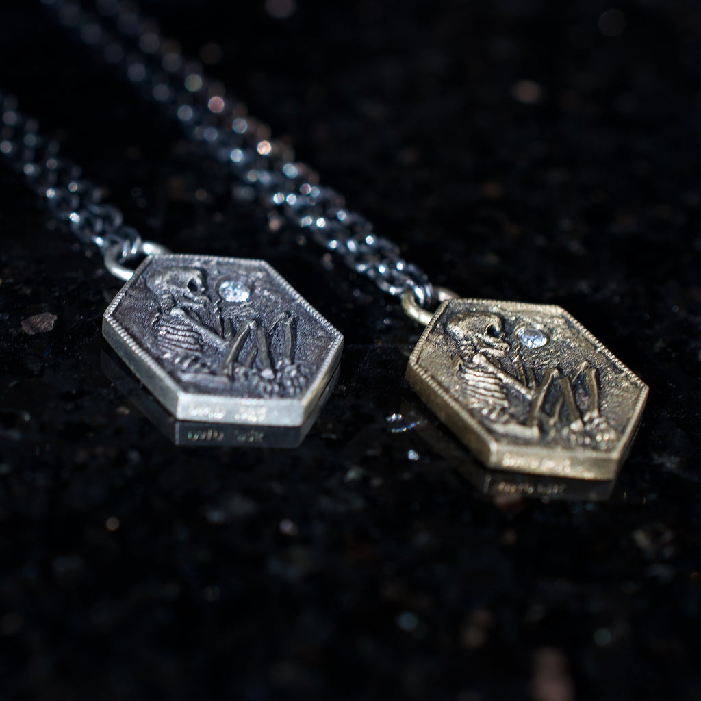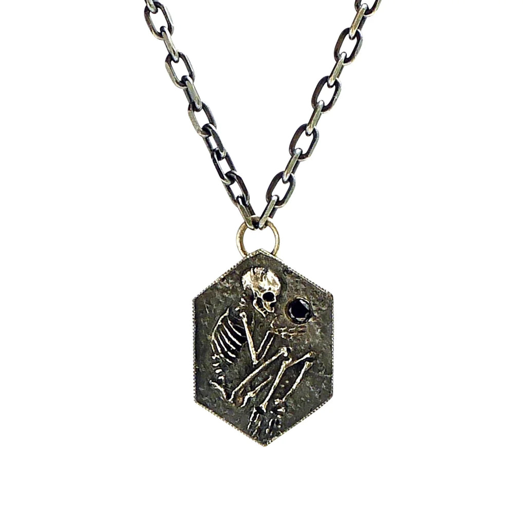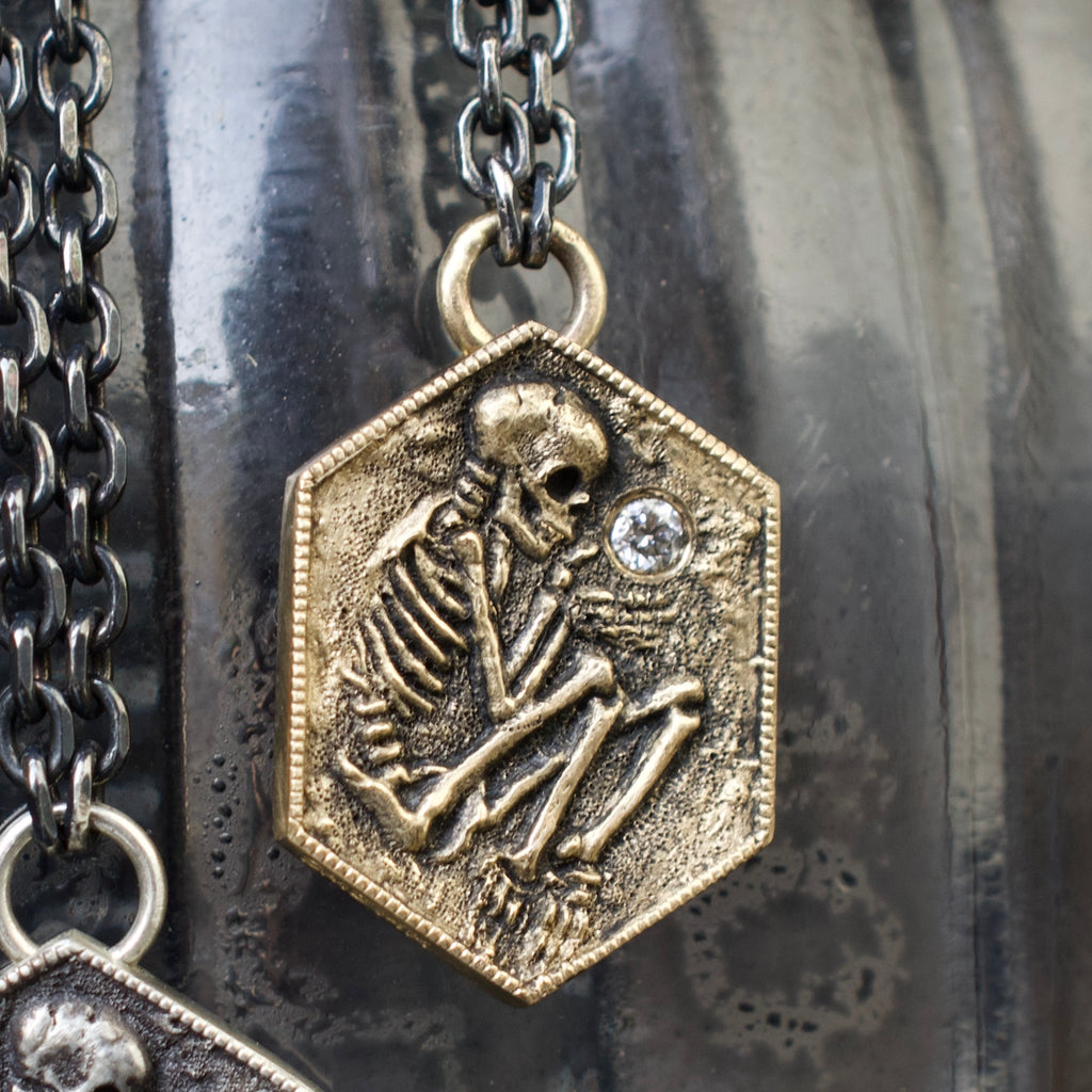 A Memento Mori depicted in the shallow grave. A tiny excavated skeleton— half in, half out. The precious commodity of time is always slipping through our fingers. This pendant is a tiny reminder- diamonds, like finer things in life, you cant take with you. Time is short, live it up.