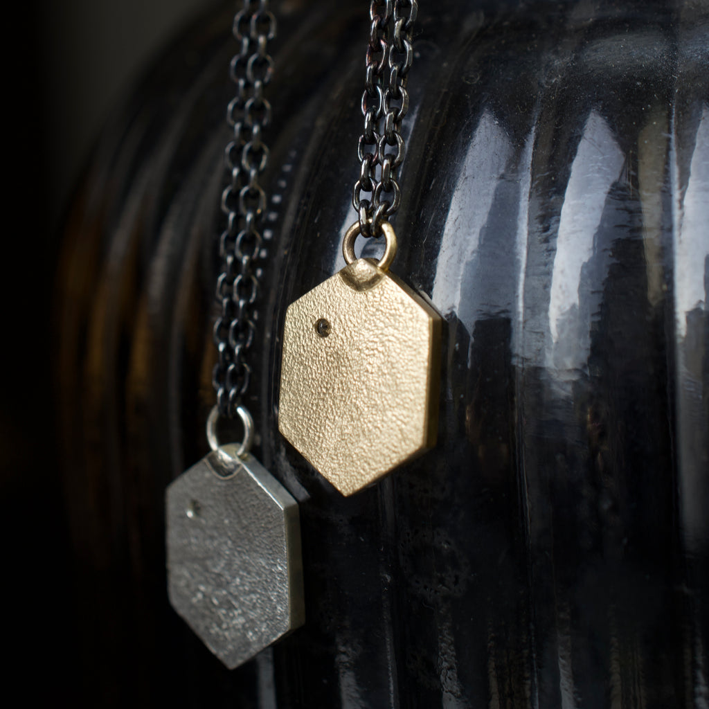 - Available with oxidized sterling silver pendant, or 14k yellow gold pendant