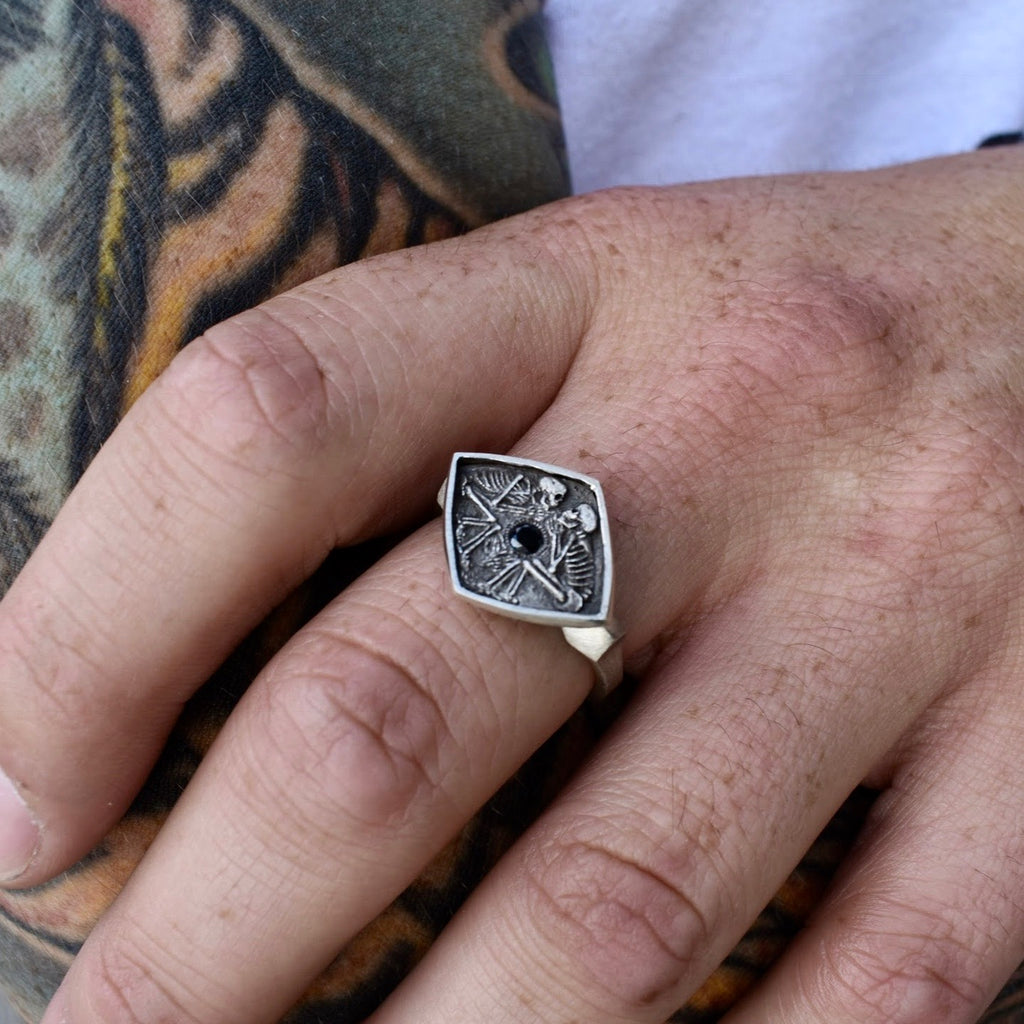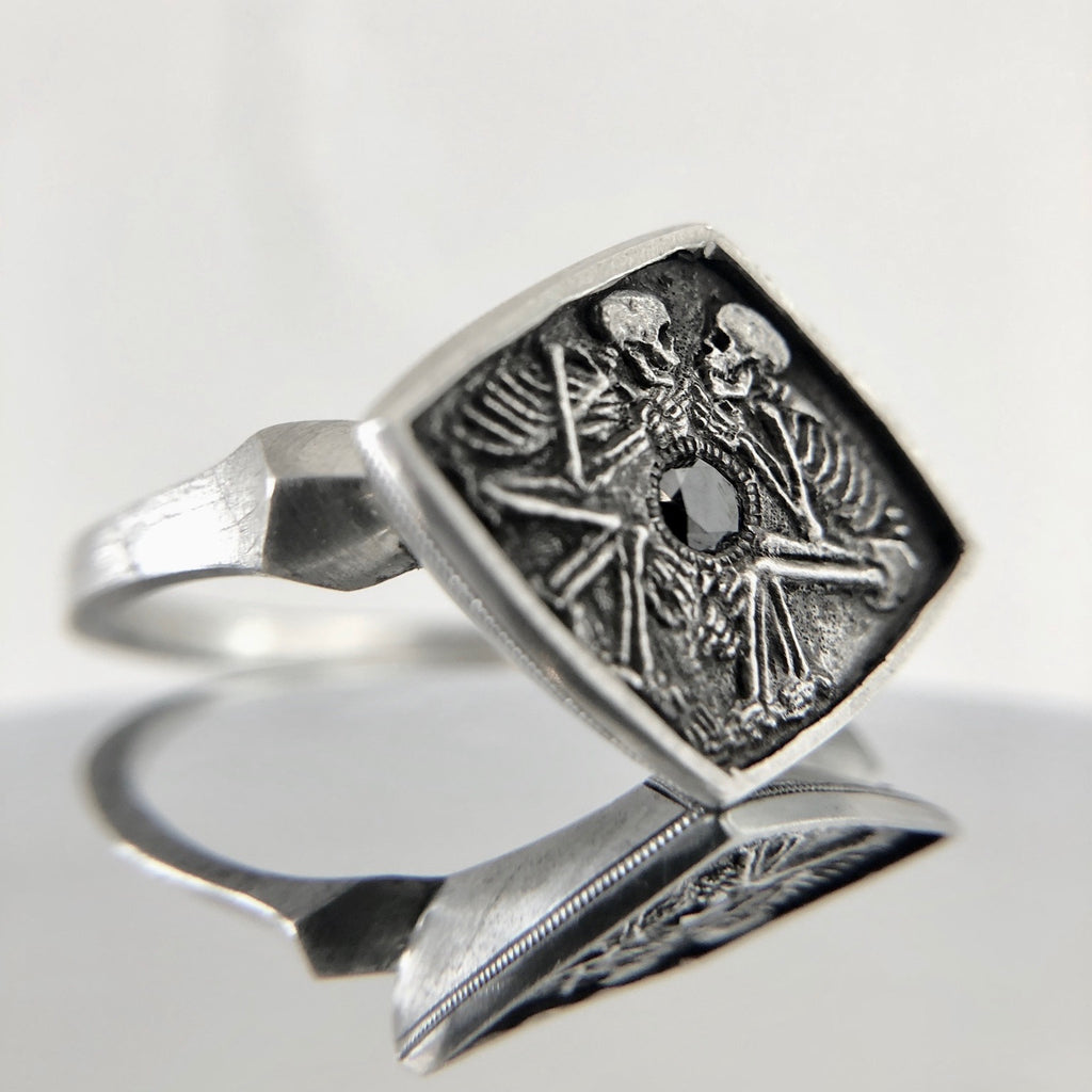 A shared grave of two skeleton figures combined in eternal repose. The space in between them is set with a black diamond surrounded by a delicately beaded edge. The bezel of the ring is decorated with a hand-engraved, milgrain border. This extraordinary piece is hand-carved, modeled, and fabricated by DMD in Raleigh, NC.