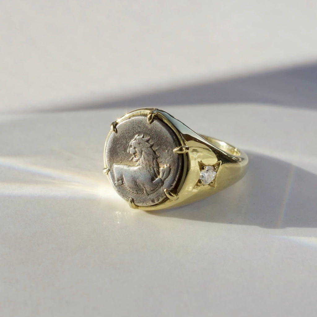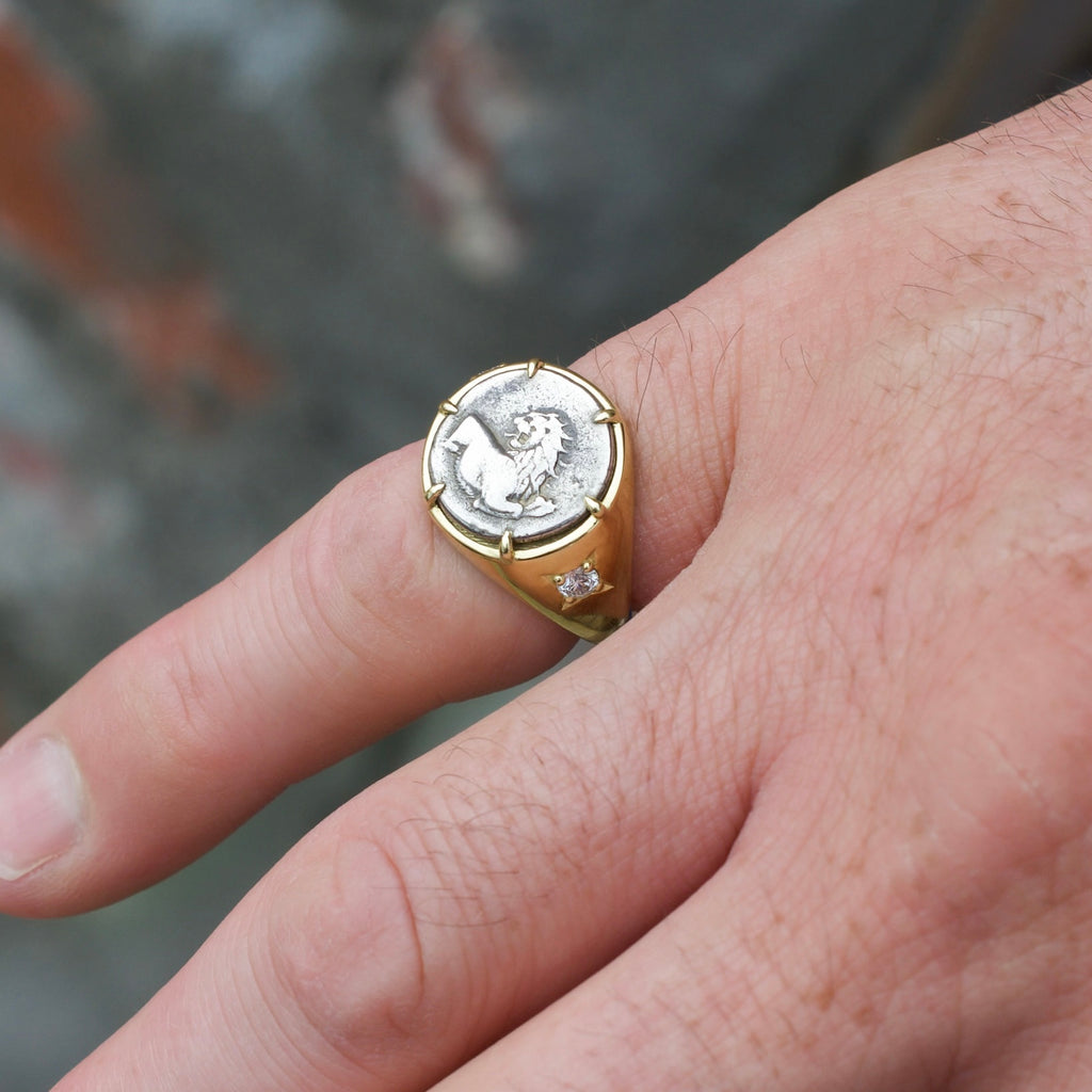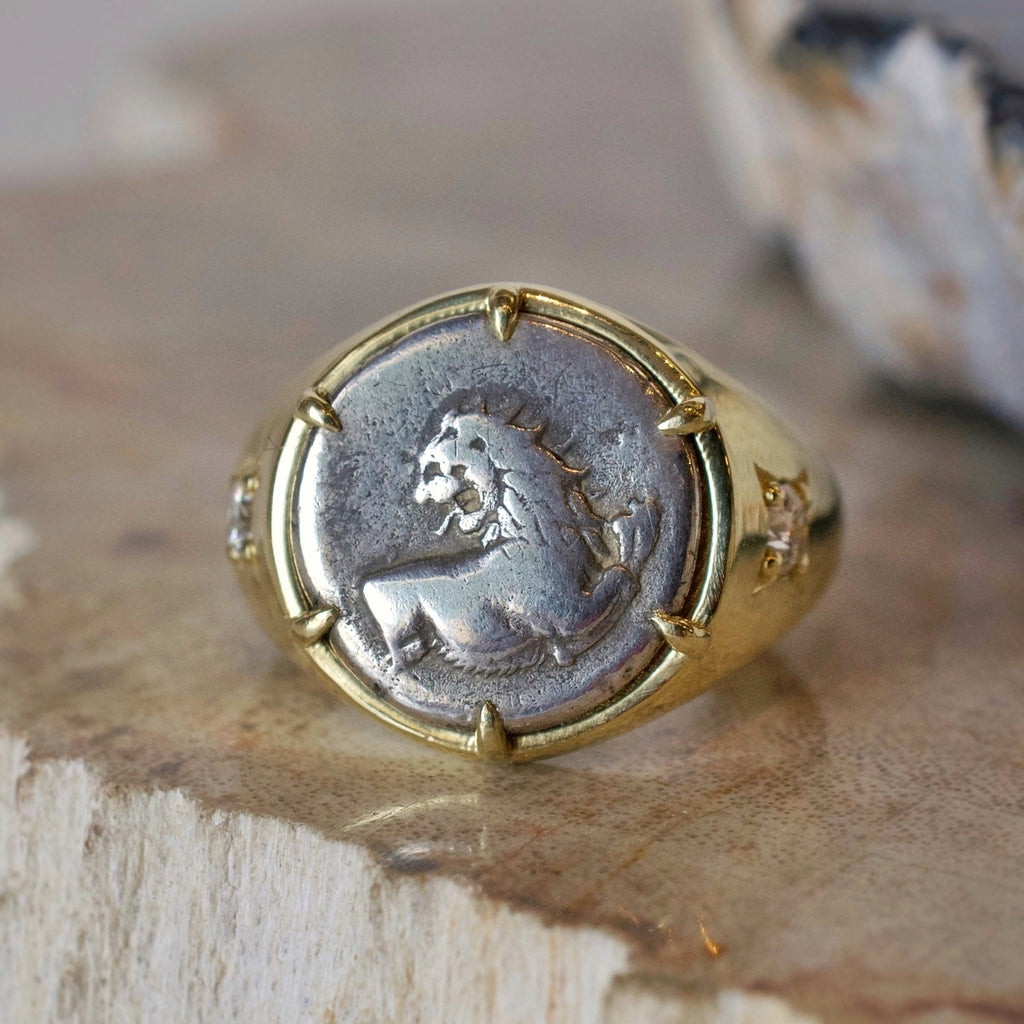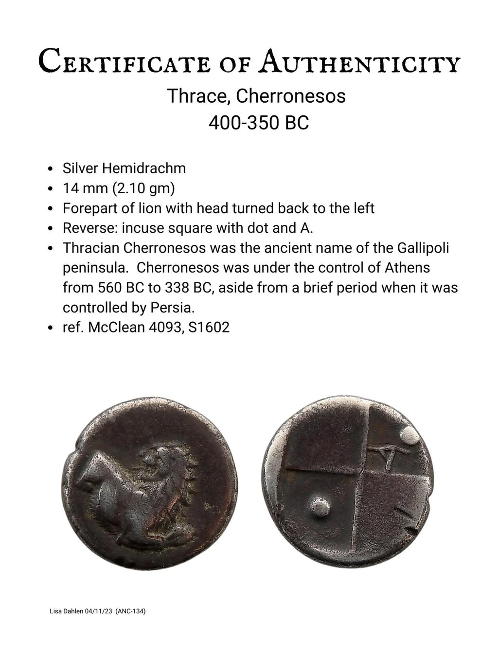 This authentic ancient silver coin features an elegant lion turning to look back over its shoulder. You tap into your inner strength with a Lion talisman to find your authentic voice. This coin has an incuse stamped square on the back as is typical for archaic coins.