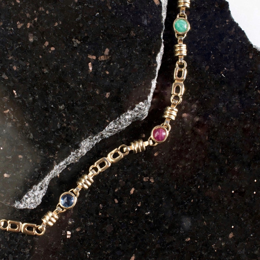 • Features natural 5.5mm cabochon emerald, ruby and sapphire