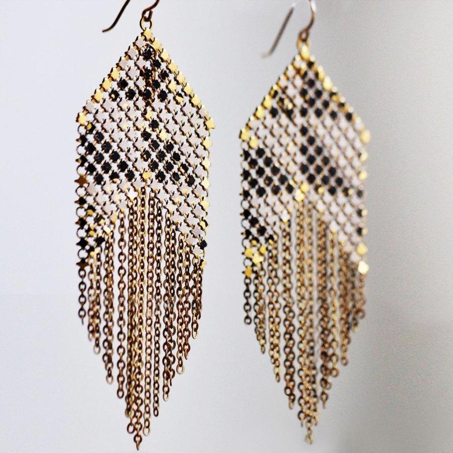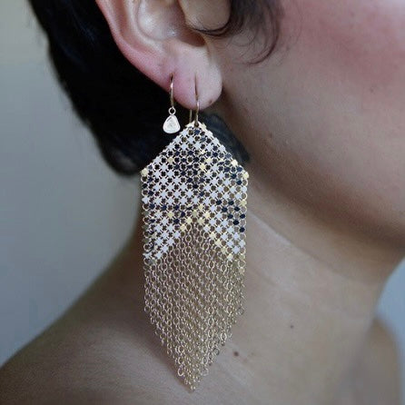 Softly weathered to a glittering gold, antique metal mesh makes a bold statement, but is always whisper-light. One-of-a-kind pattern has unique wear and patina. The original, hand-enameled Deco Era mesh is culled from an early 1900s vintage flapper purse and generously draped with a graduated panel of 14K gold filled chain. Each earring is signed with Maral Rapp logo link.