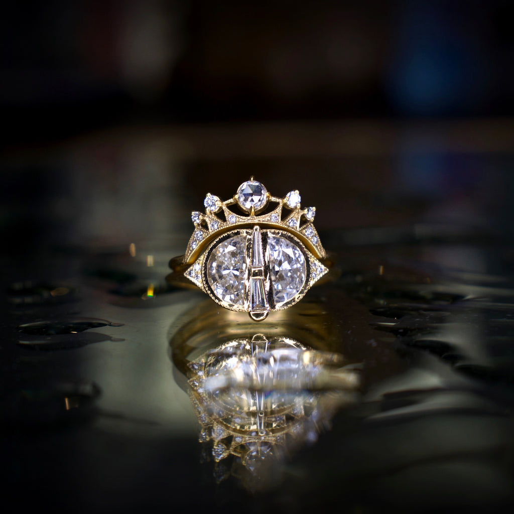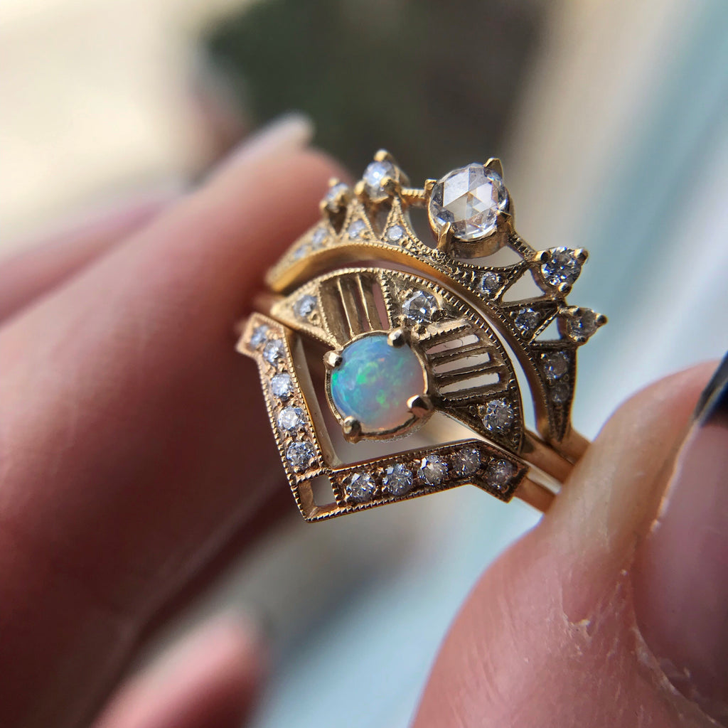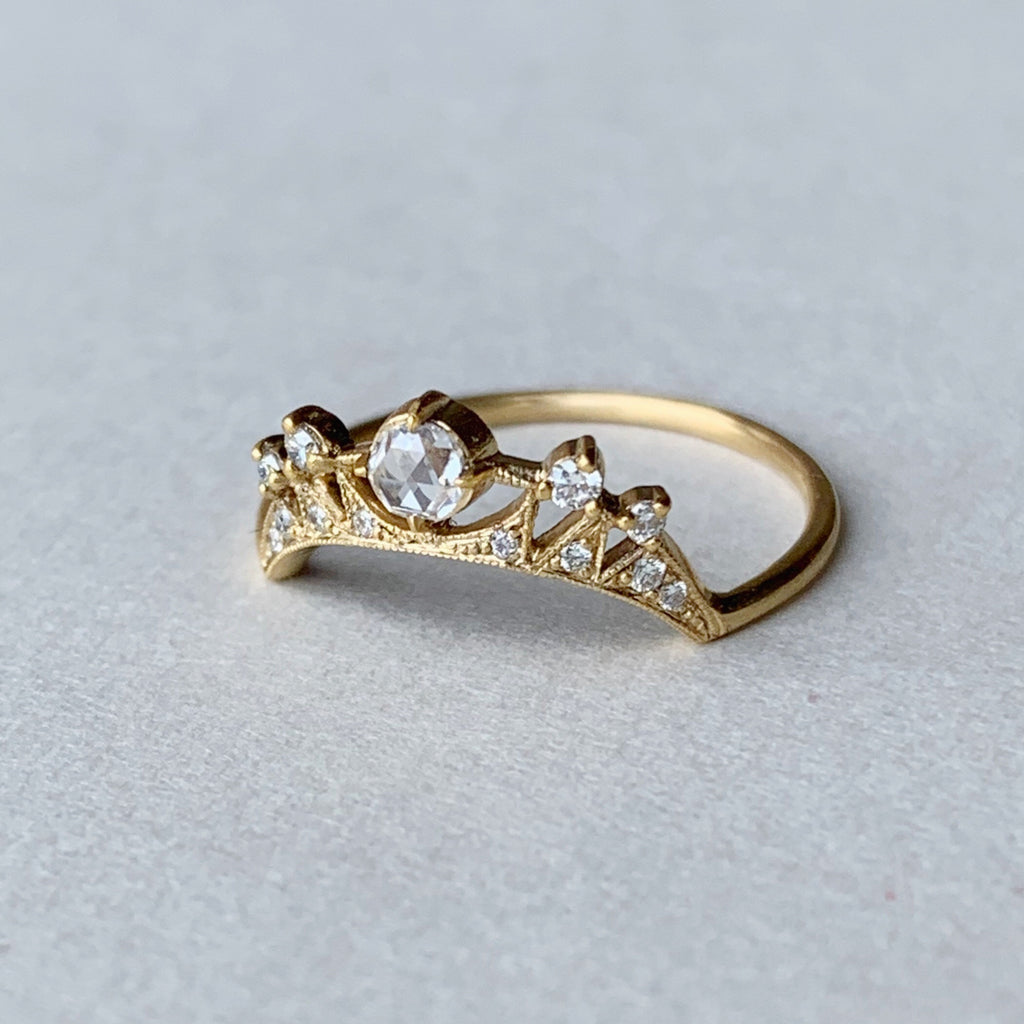 This ring is so much more than a stacking band—it’s truly a crown jewel. Bright and elegant, this ring is the thing tiaras are made of: shining diamonds and glistening gold. Sovereigns are said to have an audience with the divine and this ring speaks of crowns and constellations. We love this breathtaking adornment that embodies the power and grace of royalty.