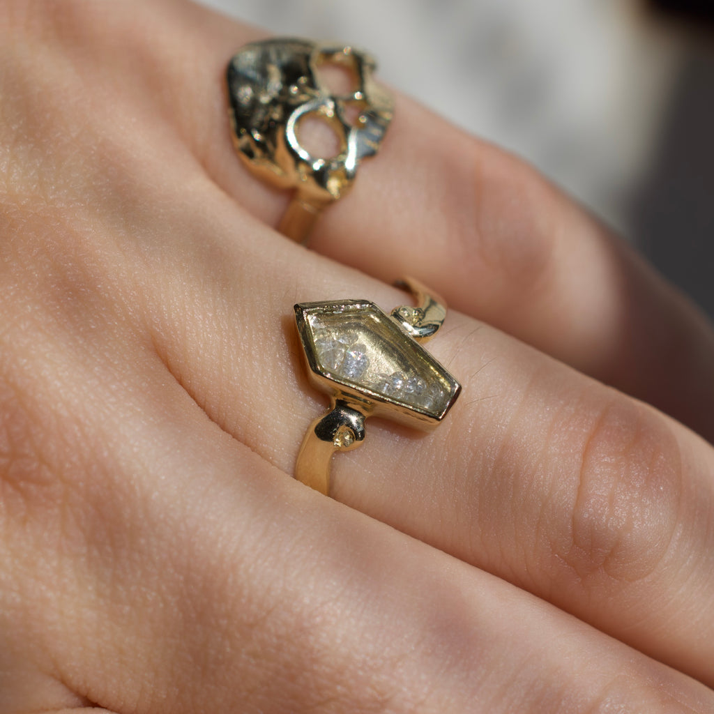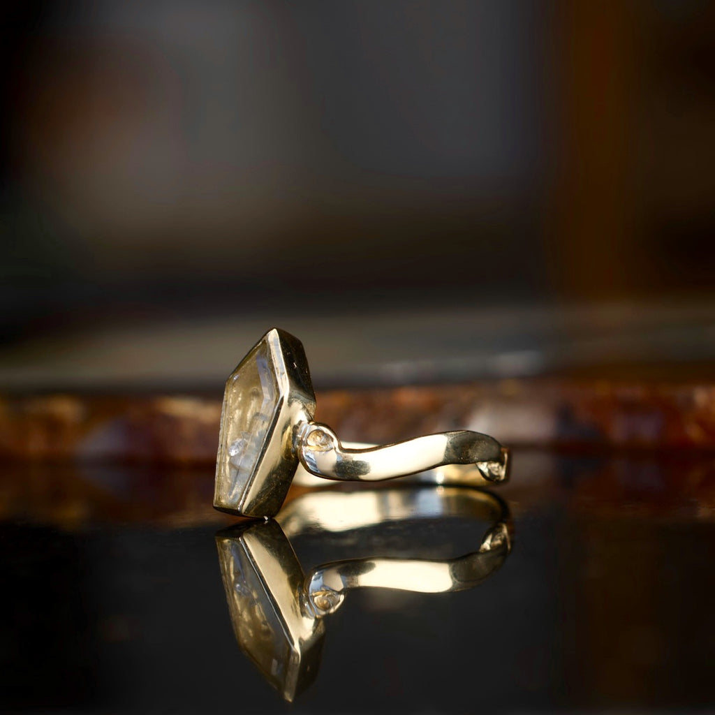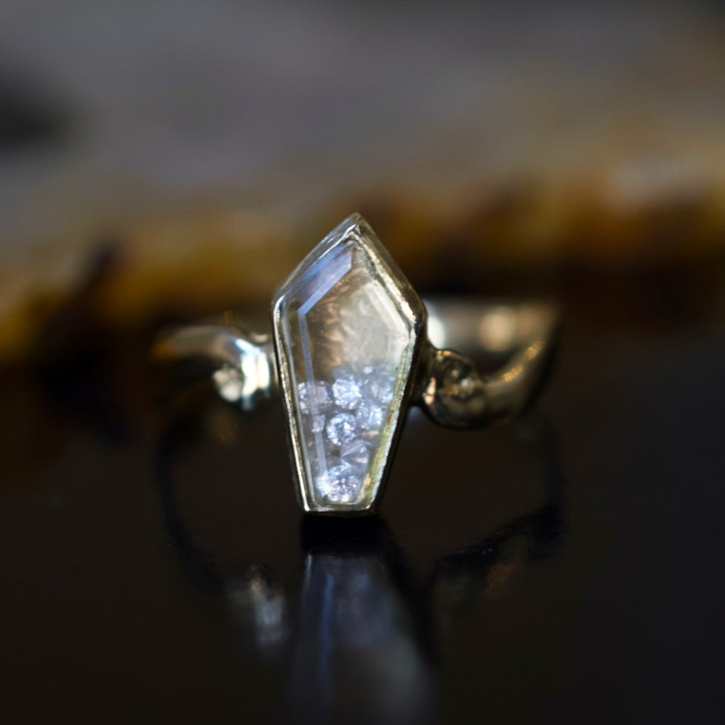 A sprinkling of teensy white diamonds float around beneath a hand cut clear coffin crystal-
