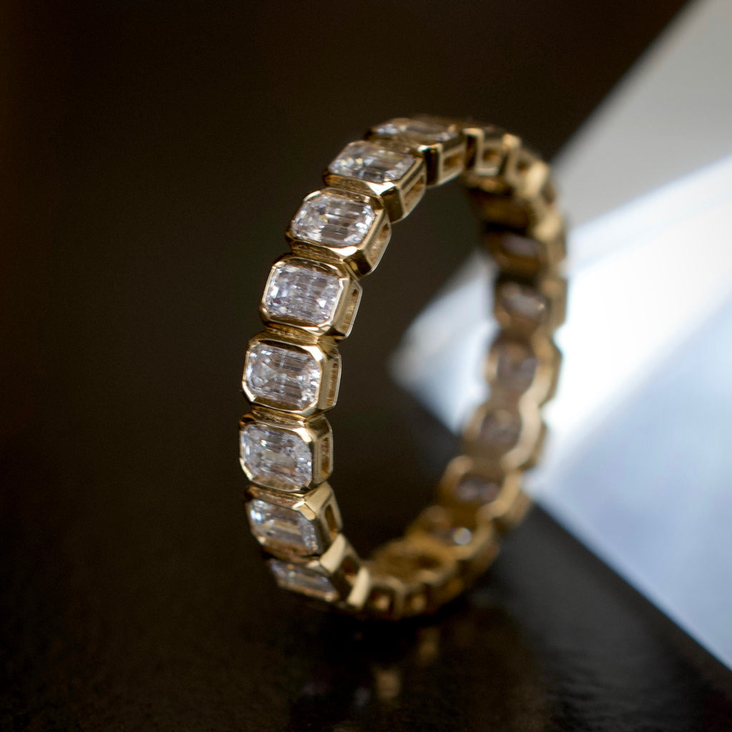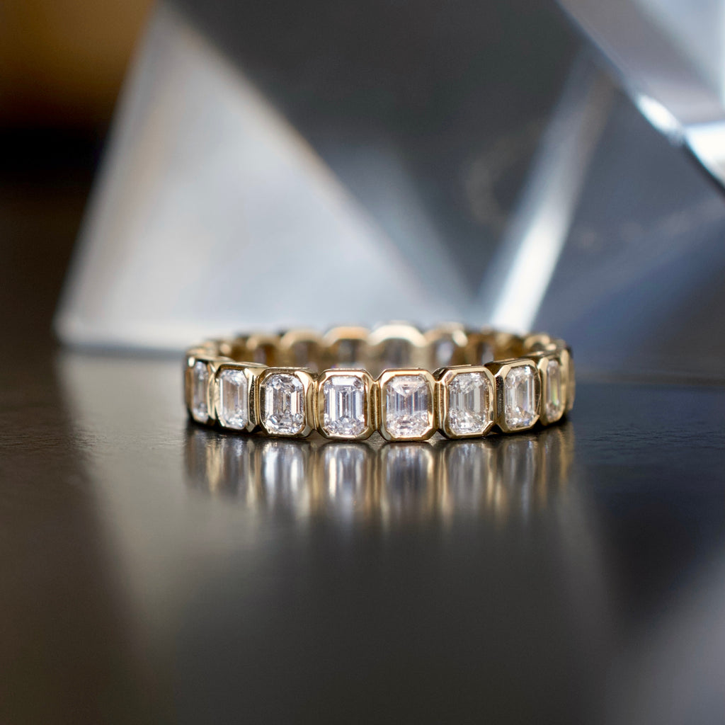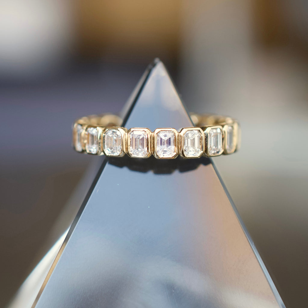 Oh, diamonds... this ring wears like an ode to the earth's most breathtaking stone. Here, a full two carats of bright emerald cut diamonds are set in a row, framed in softly geometric bezels that accentuate the depth of their rectangular facets. This band wears perfectly on its own, elevates any stack, or adds a little more gravitas to a ceremonial band.