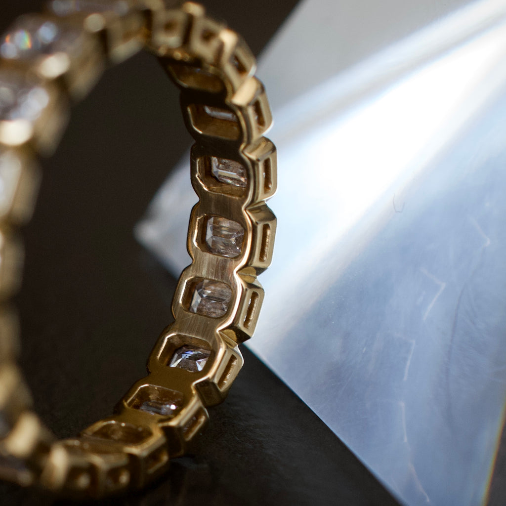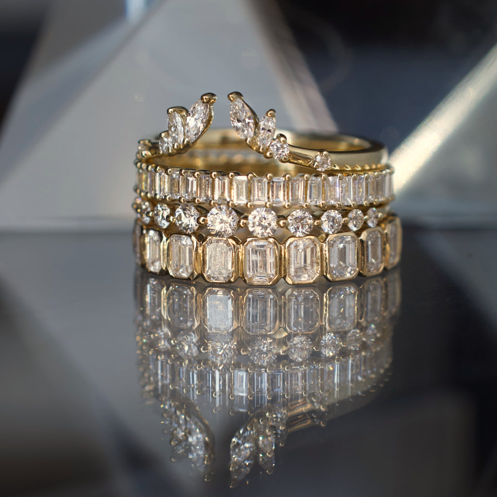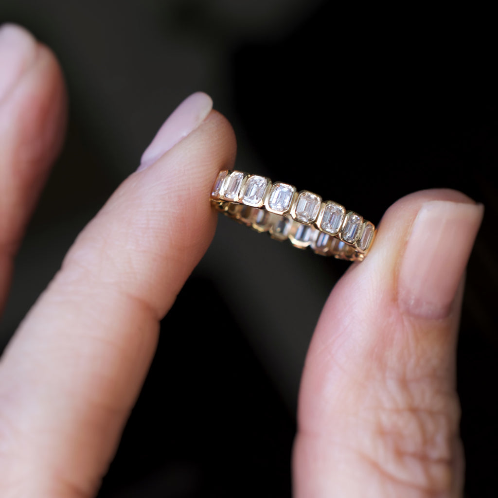Oh, diamonds... this ring wears like an ode to the earth's most breathtaking stone. Here, a full two carats of bright emerald cut diamonds are set in a row, framed in softly geometric bezels that accentuate the depth of their rectangular facets. This band wears perfectly on its own, elevates any stack, or adds a little more gravitas to a ceremonial band.