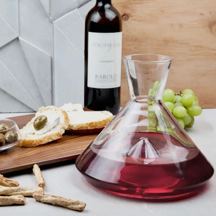 When wine is decanted, the oxygen exposure allows the flavors to develop in seconds, not years, so you get a brighter bouquet and clearer tasting notes. The decanter and its center peak showcases the inspiration of the Italian Alps.