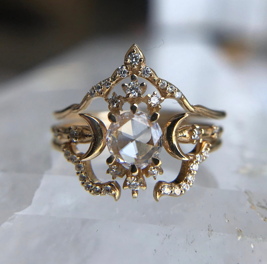 Now, this tender sentiment is embodied in the form of a ring linking all of these astral bodies together in a wearable piece of poetry. This breathtaking ring features a beautiful 5mm Canadian-mined diamond and 10 brilliant diamonds on a 1.2mm solid gold band. The center diamond carat weight is approximately 0.4ct and the total carat weight for the ring comes in around 0.6 - 0.65 ct. The center diamond is of excellent round rose-cut and clarity.